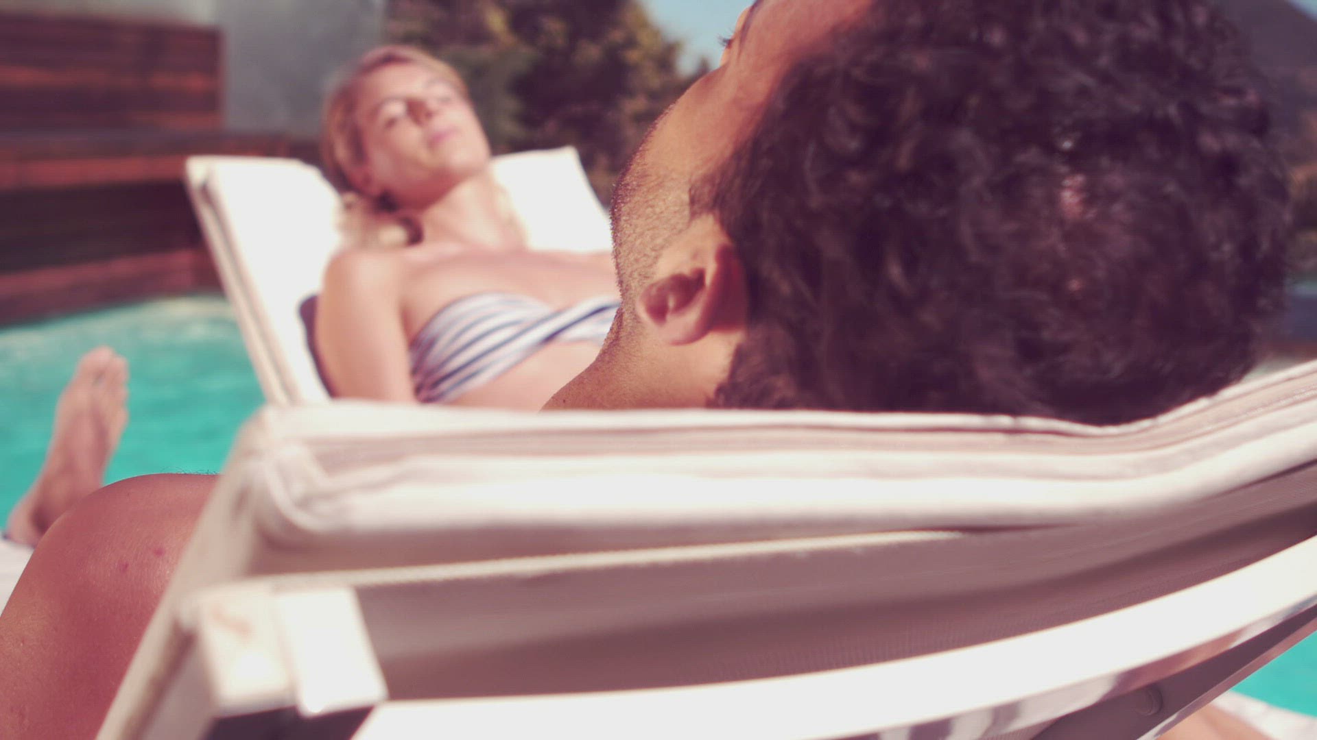 Attractive couple relaxing by the pool in slow motion