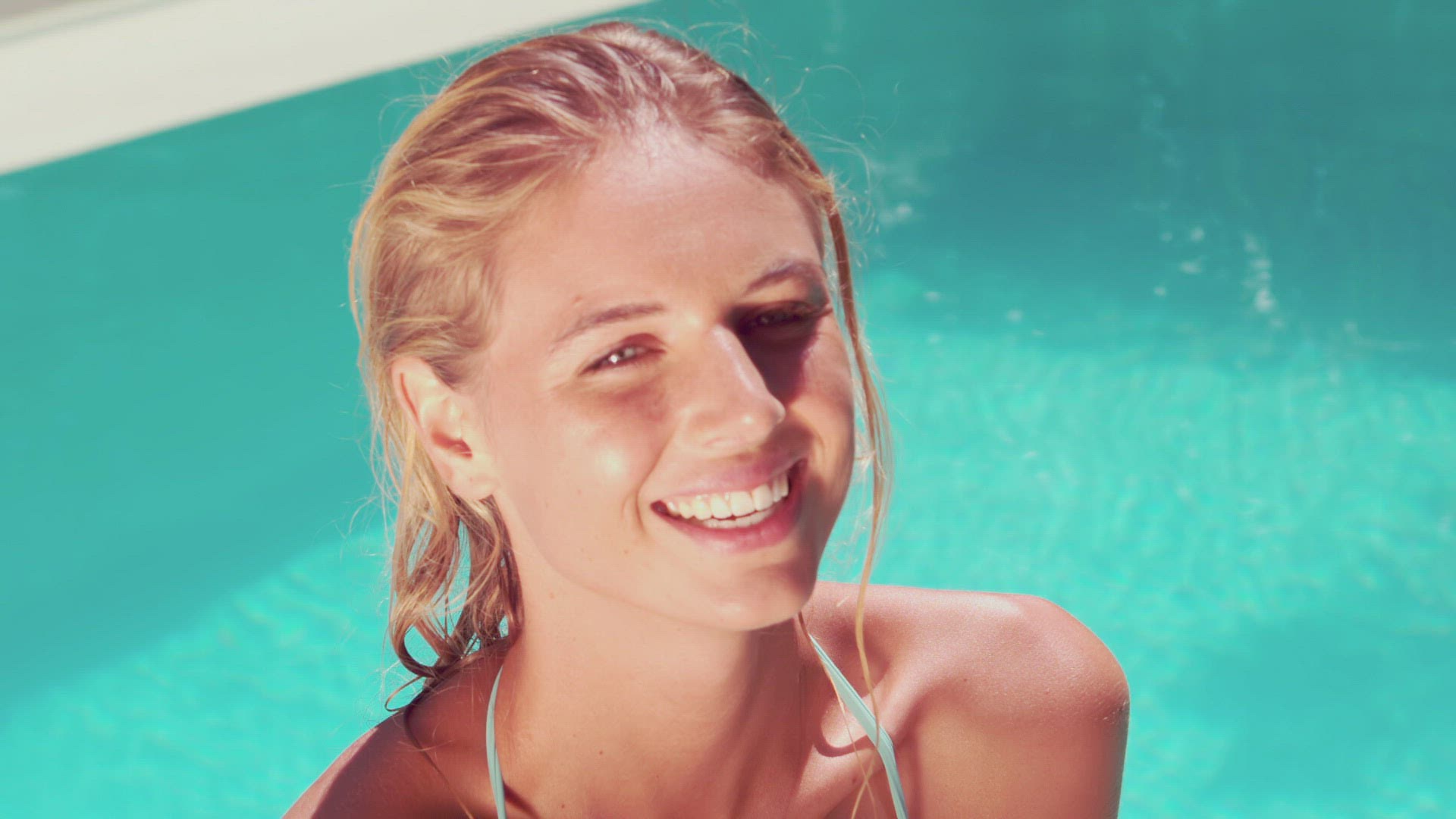 Attractive woman in pool blowing kiss to the camera in slow motion