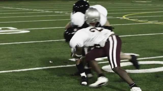 > Close up of a football running back getting tackled by two defenders