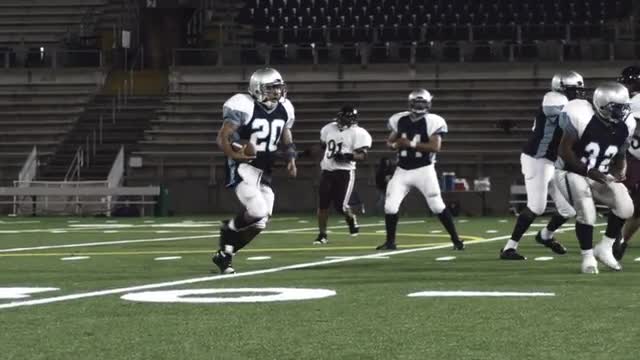 Close up stedicam shot of a football team in a huddle and rushing to the line