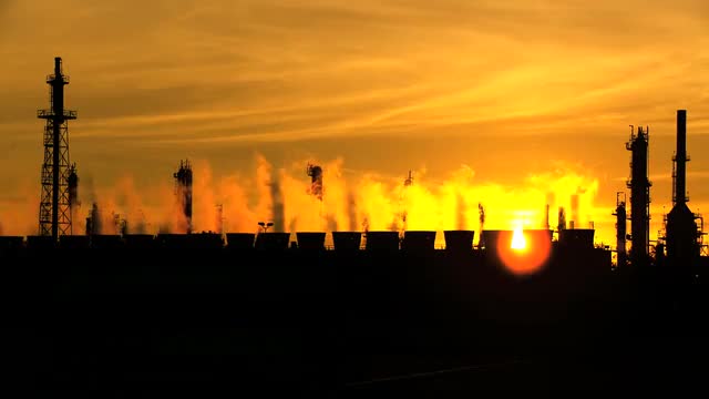 Smoke from oil refinery chimneys polluting the environment against golden sunset backdrop