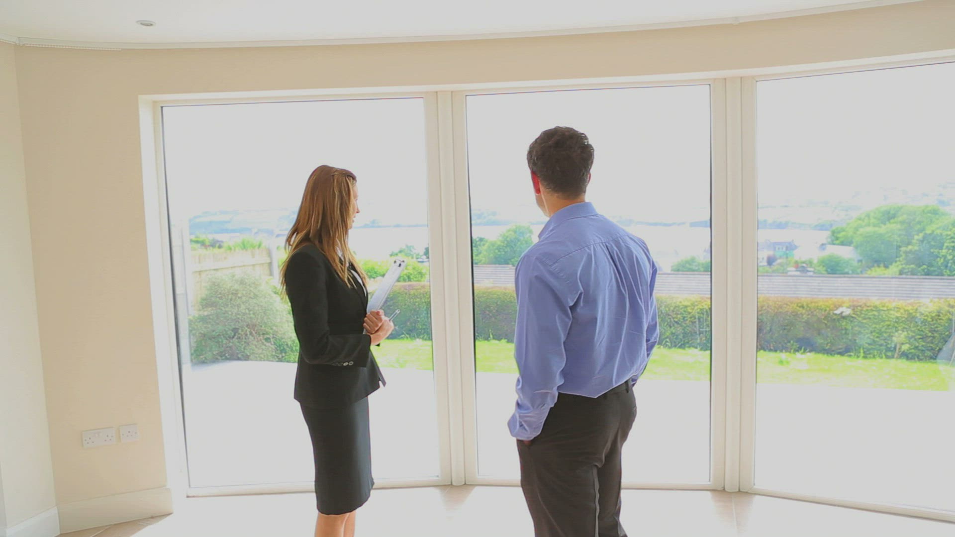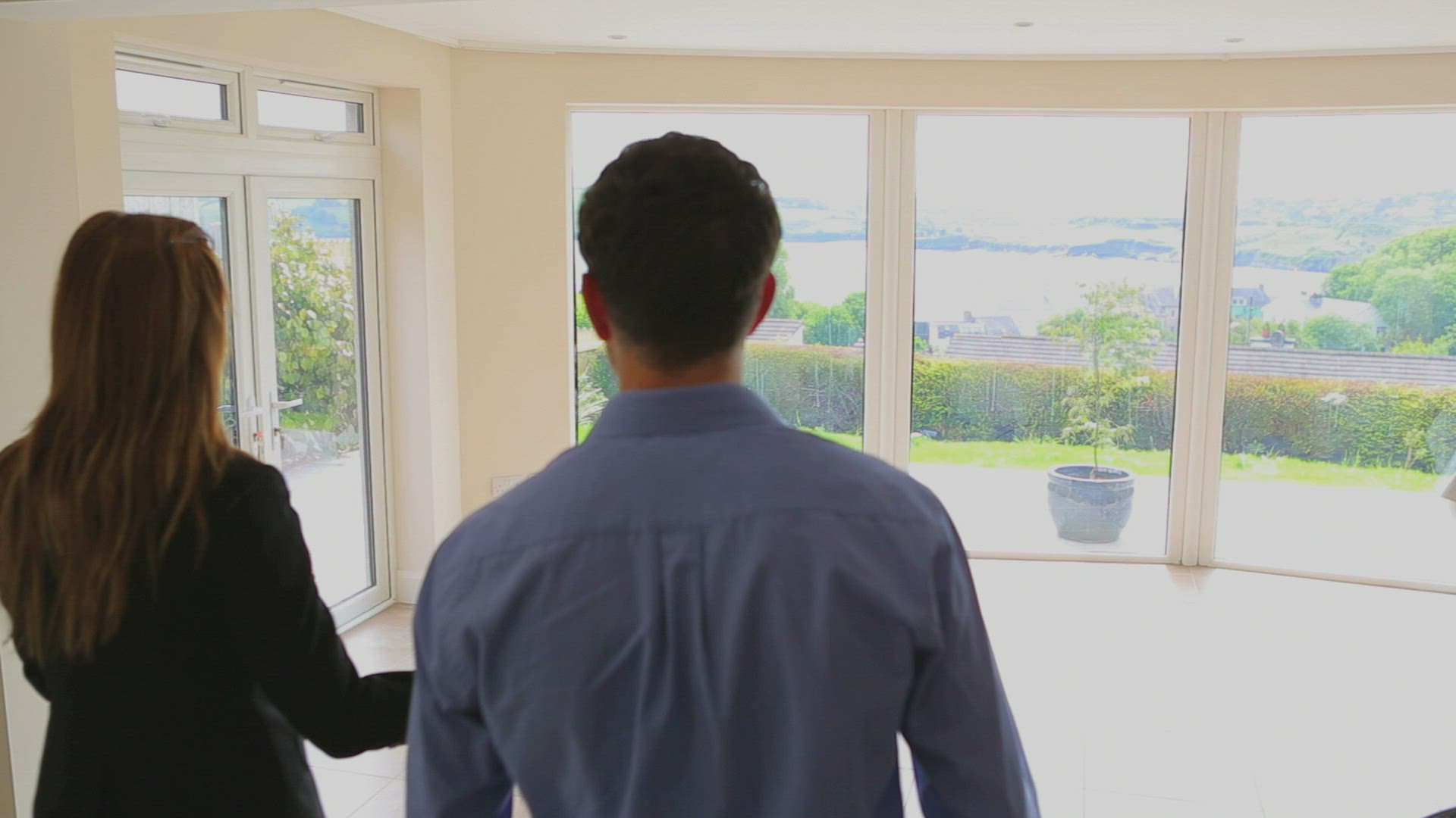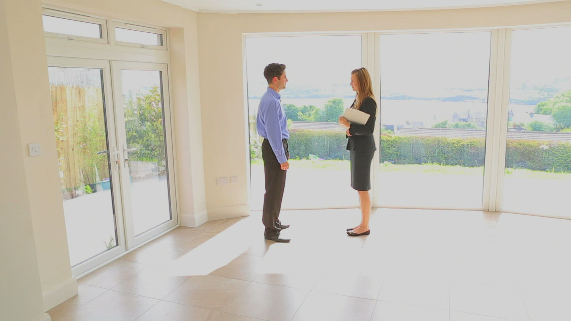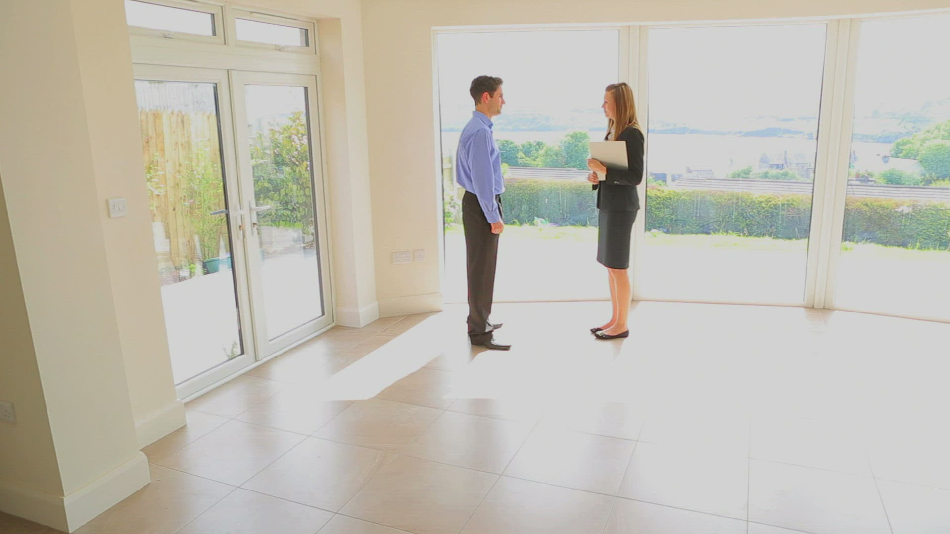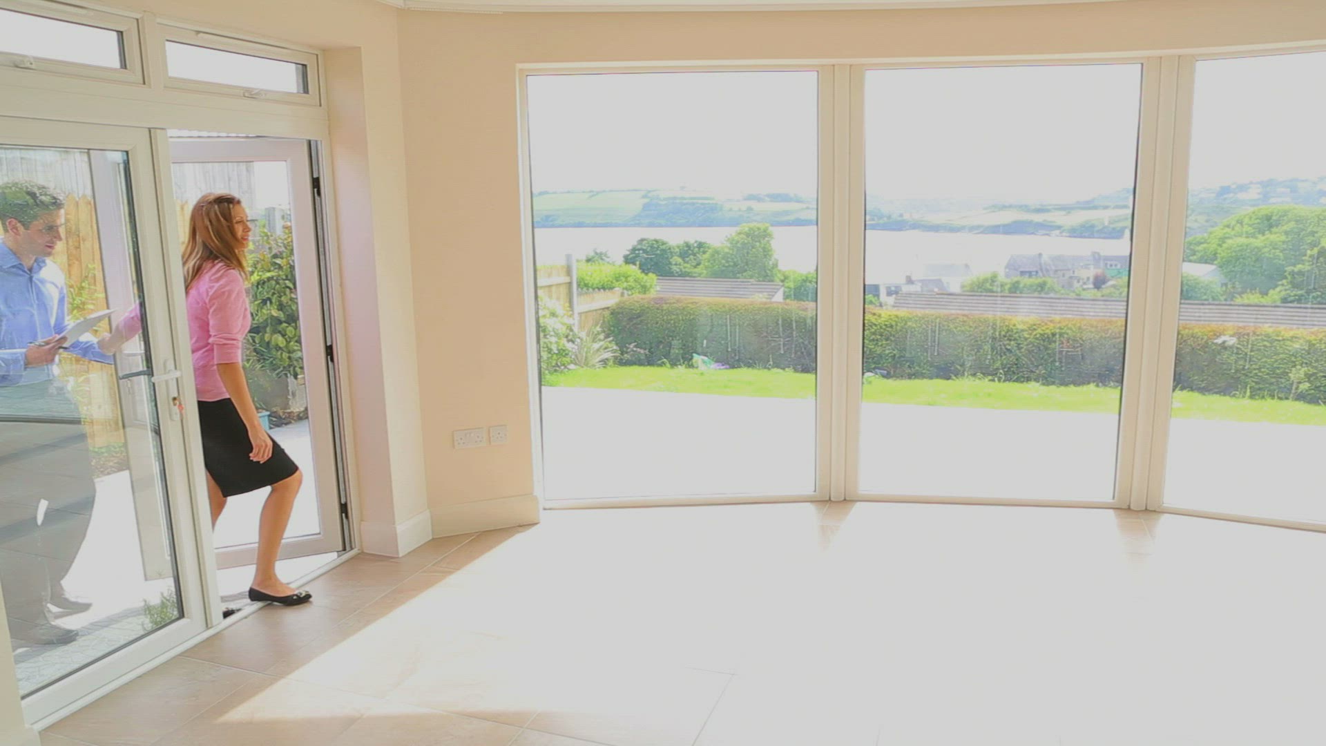 Couple come out of front door and stand next to for sale sign and smile at camera. Shot on Canon 5d Mk2 with a frame rate of 30fps