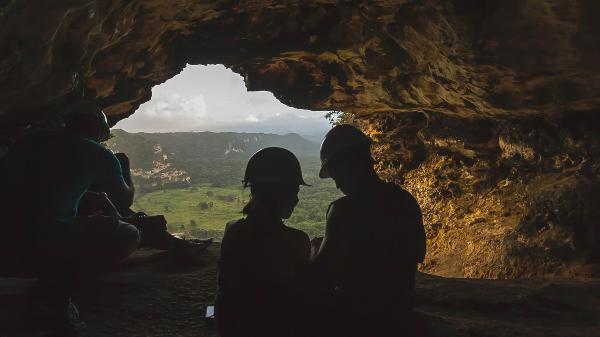 Visitors sit taking a resting at the Cave Window overlooking the Arecibo Valley in Puerto Rico.