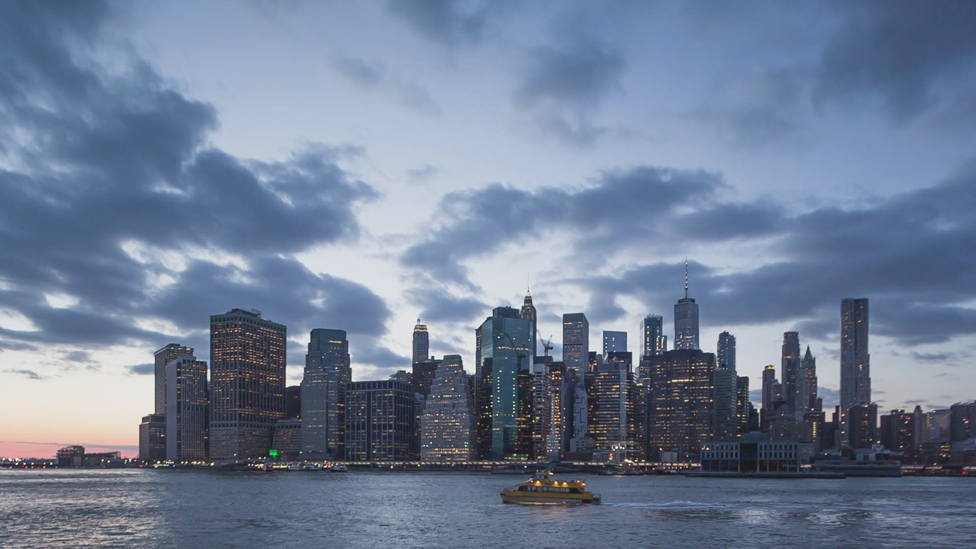 Clouds pass over the downtown Manhattan skyline at twilight.
