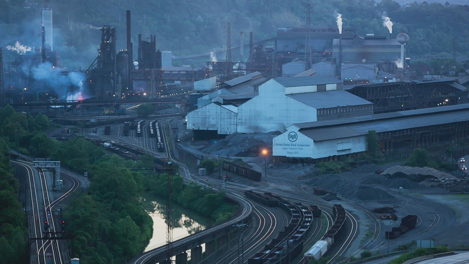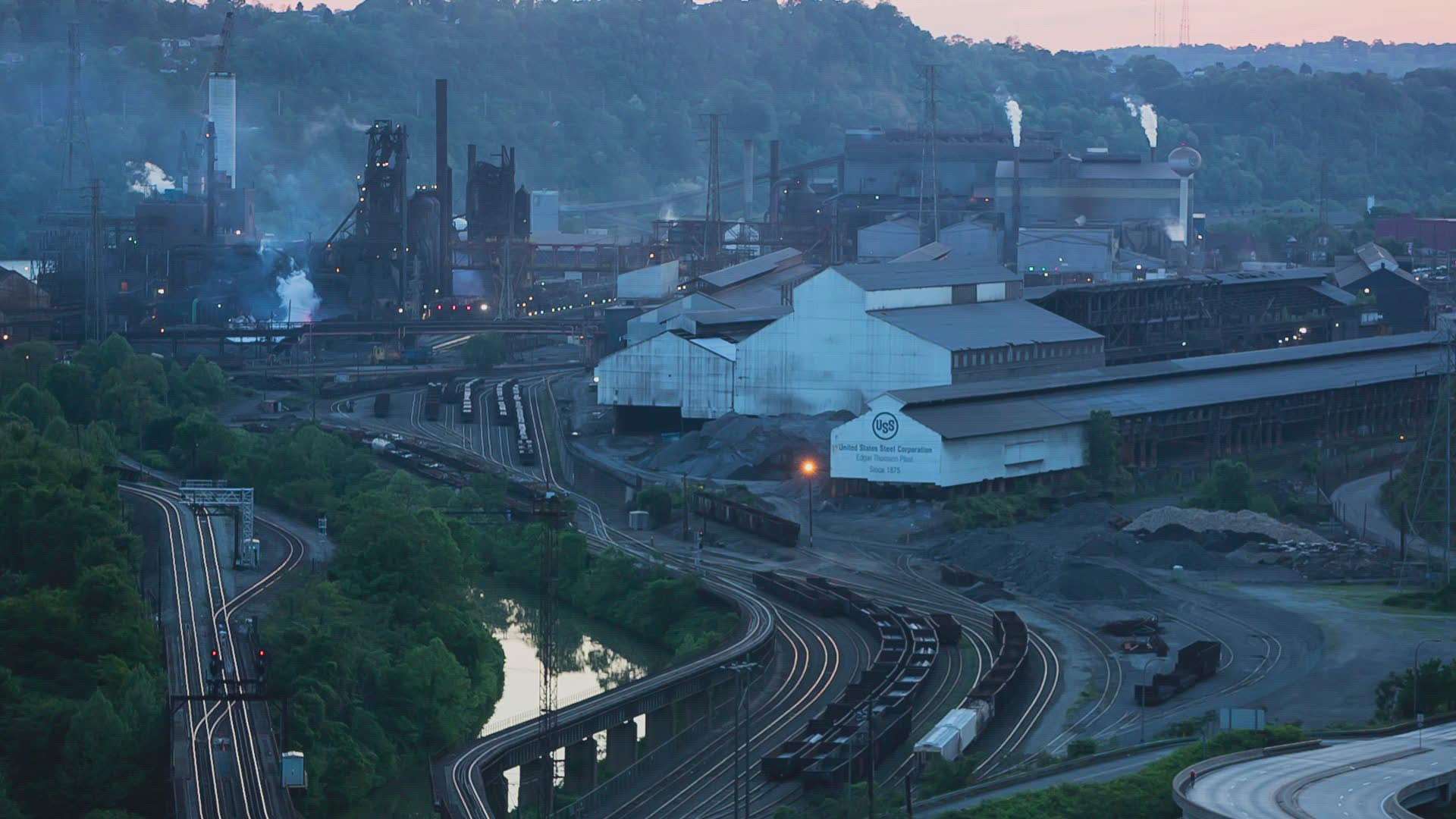 Smoke rises from the United States Steelworks at dusk in Braddock, east of Pittsburgh,Pennsylvania.