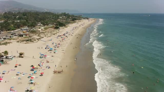 Aerial shot of a costal town in California flying towards the beach and the Pacific Ocean.