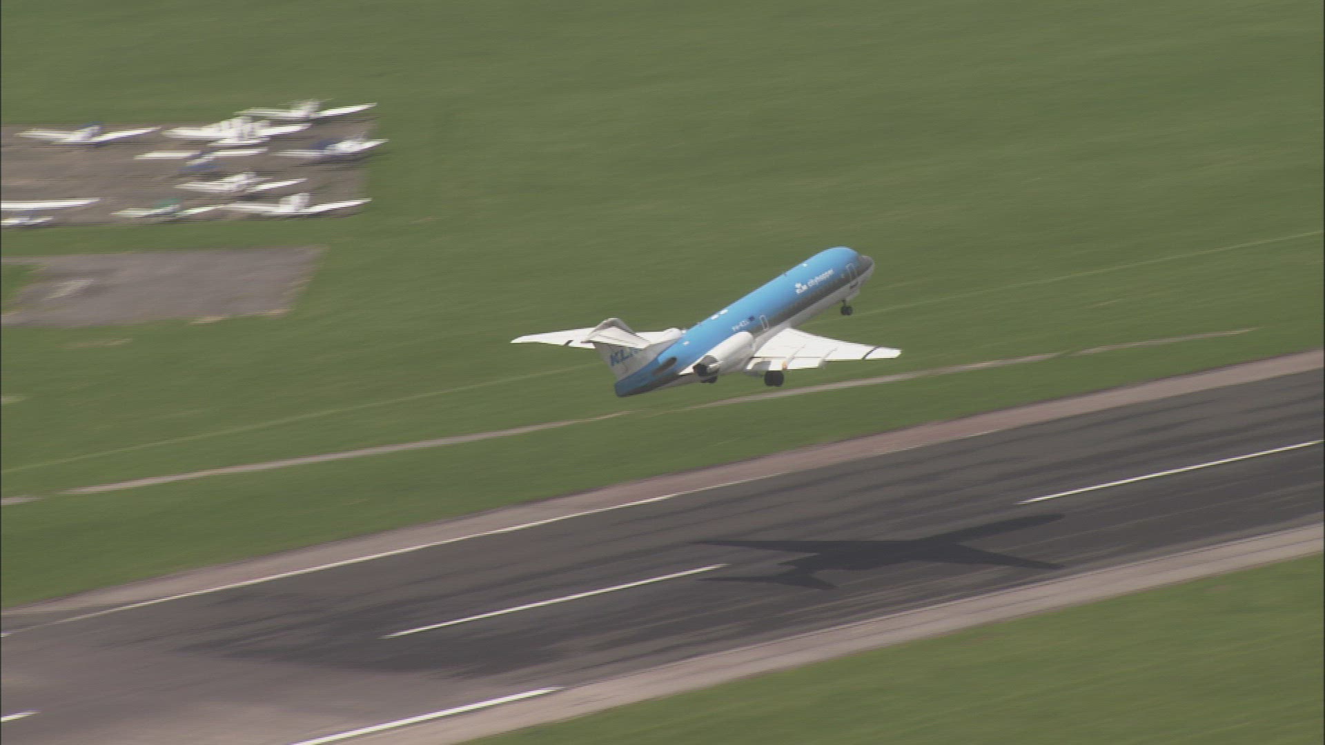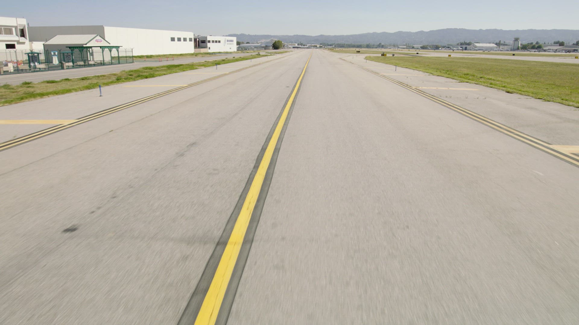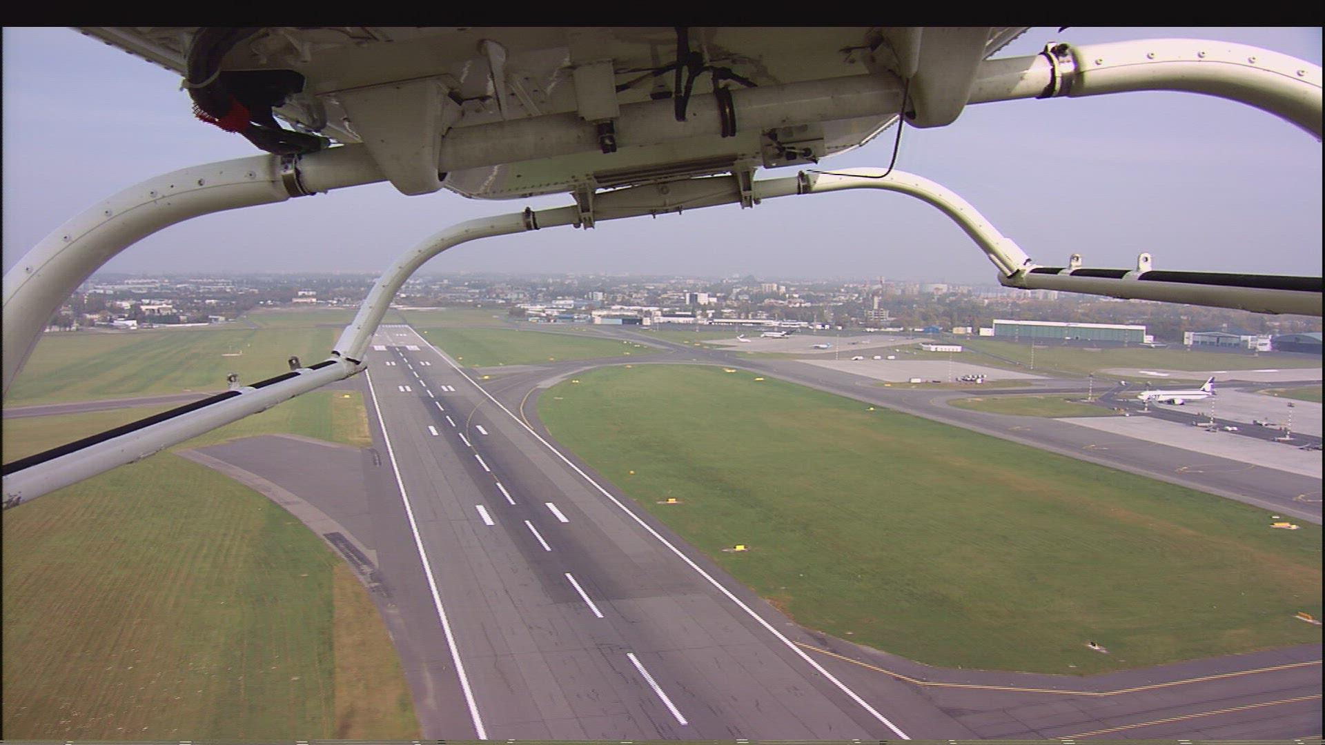 Aerial shot from the POV of an airplane taking off.