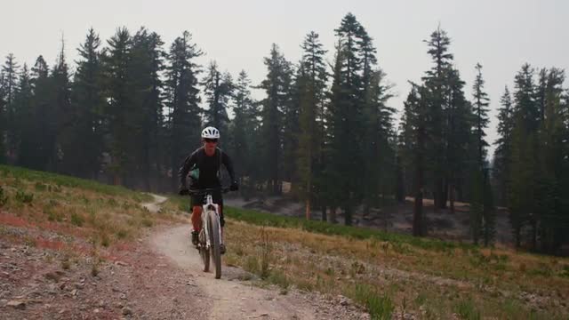 165361 - A mountain biker rides on a dirt path away from a forest.