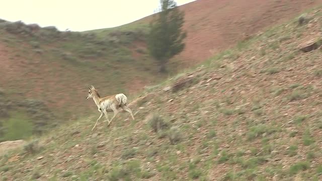 A pronghorn runs across a hillside.