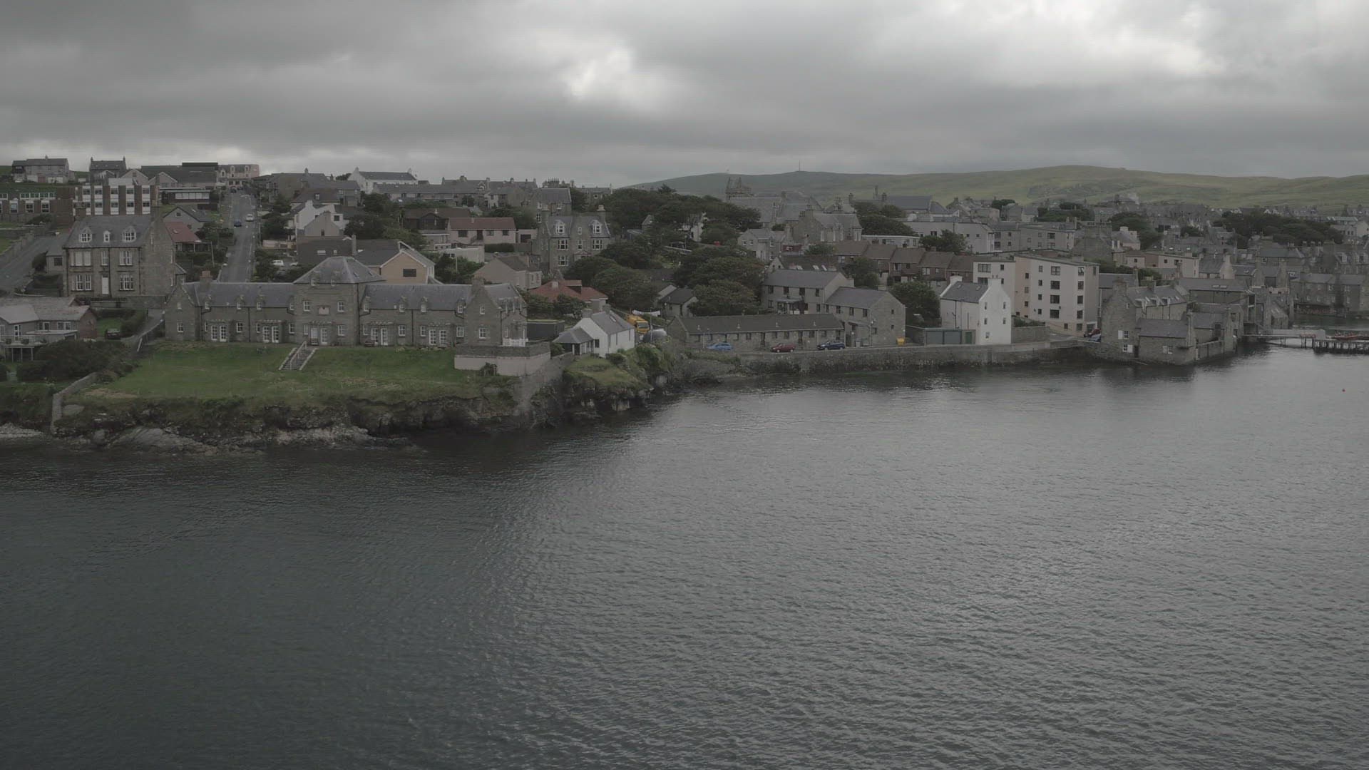 shot of a ship/boat coming back from the sea, town in sight, camera following ship towards harbor