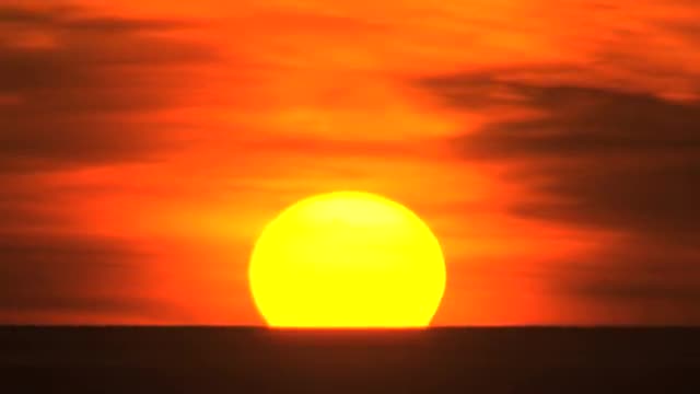 Time-lapse of full glowing sun dramatically rising from the darkness below the ocean horizon into an abstract cloudscape