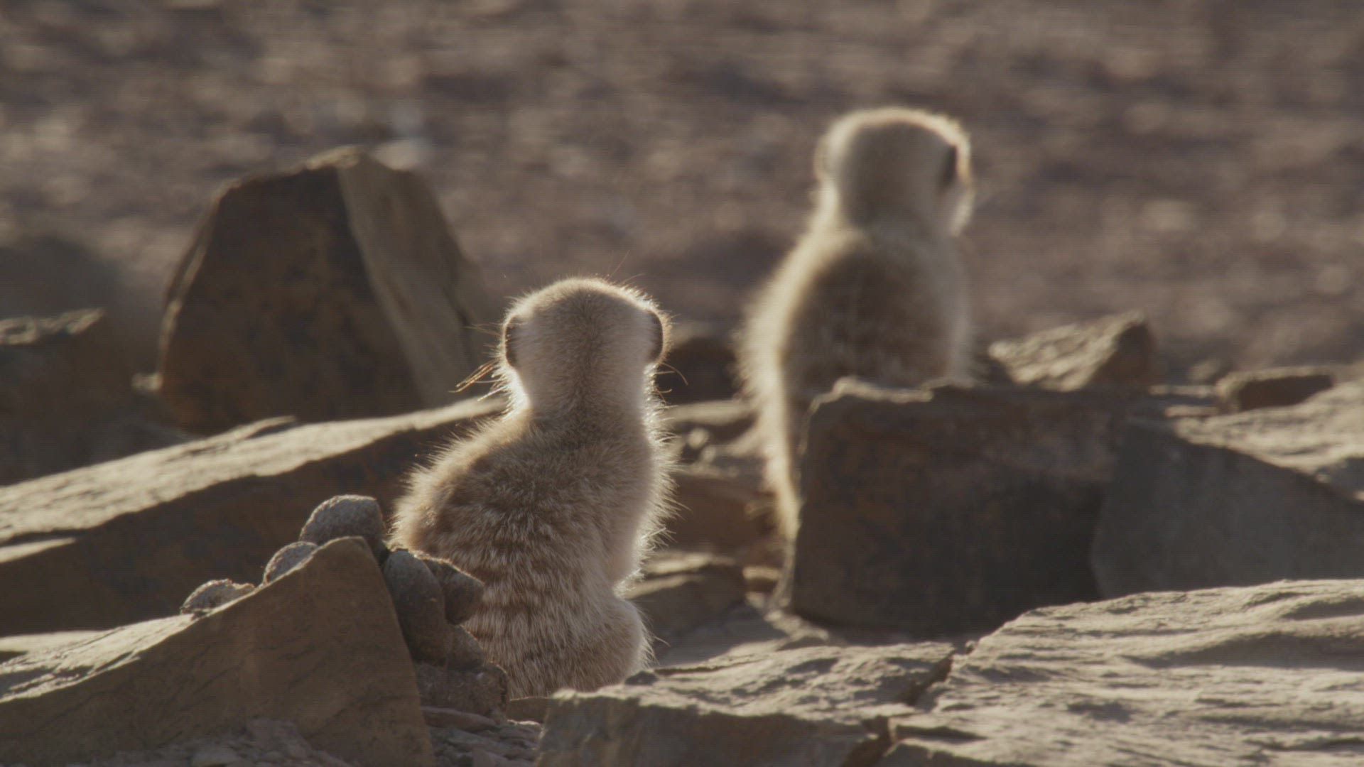 MS Meerkat (Suricata suricatta) sitting on barren rock and other meerkats in background passing by /Namibia