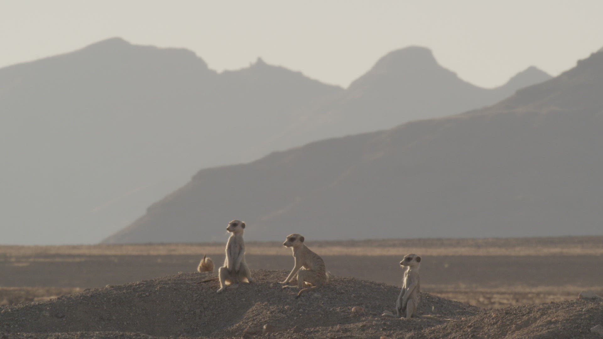 WS Meerkats (Suricata suricatta) looking around with mountain landscape in background / Namibia