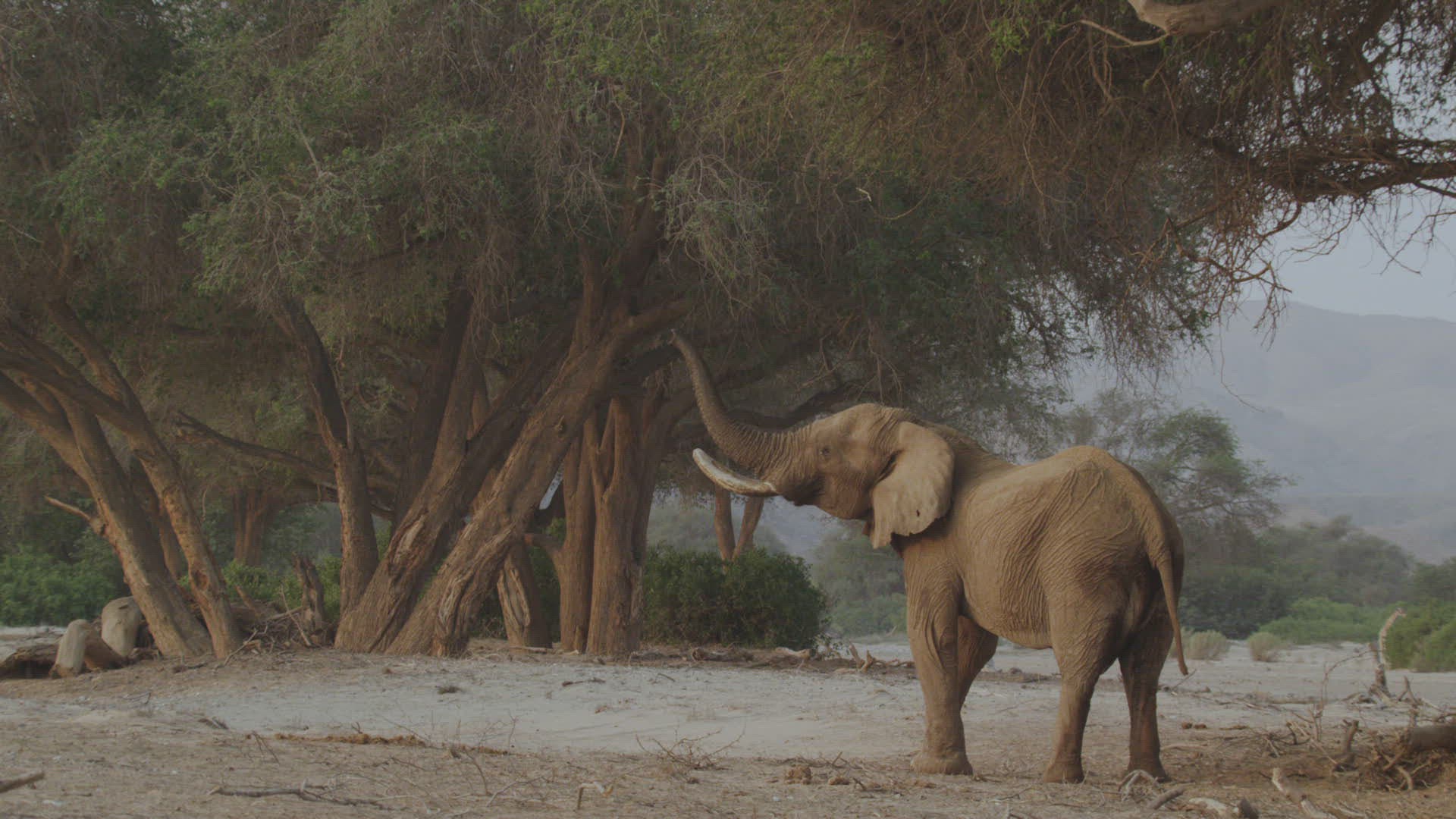WS SLO MO TU Elephant (Loxodonta africana) raising trunk to reach tree/Namibia