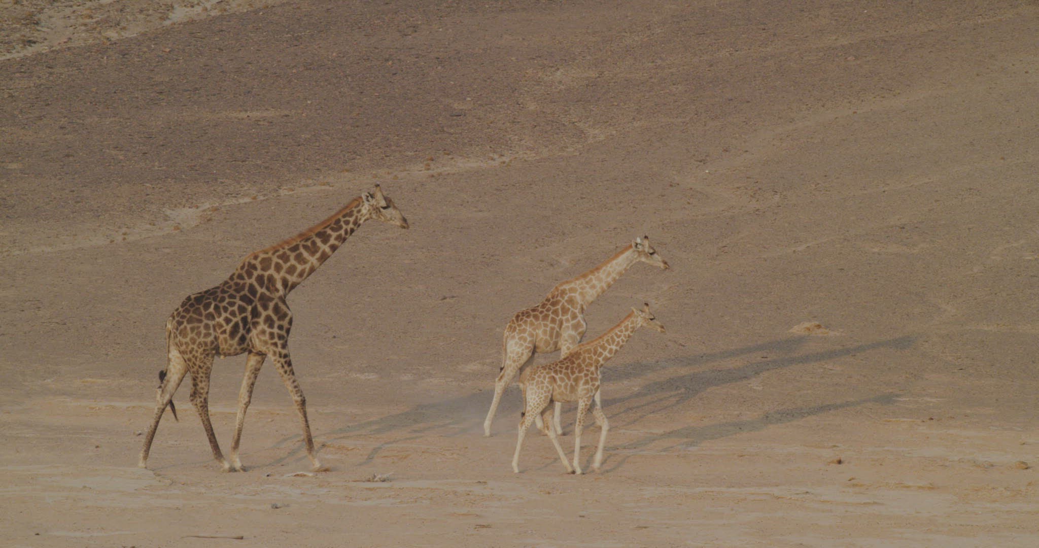 WS PAN Giraffes (Camelopardalis giraffe) walking on sand/ Namibia