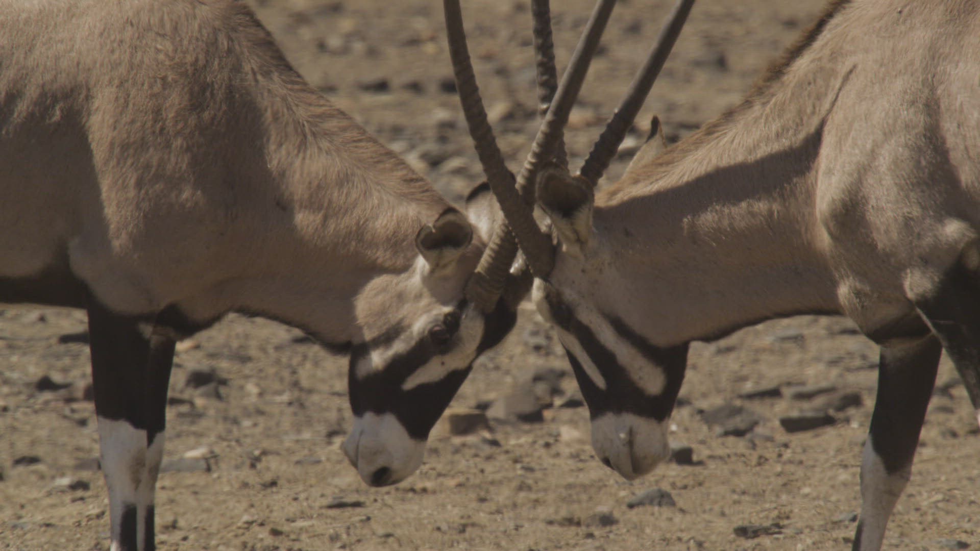 MS SELECTIVE FOCUS SLO MO Two male gemsboks (Oryx gazelle) fighting/ Namibia