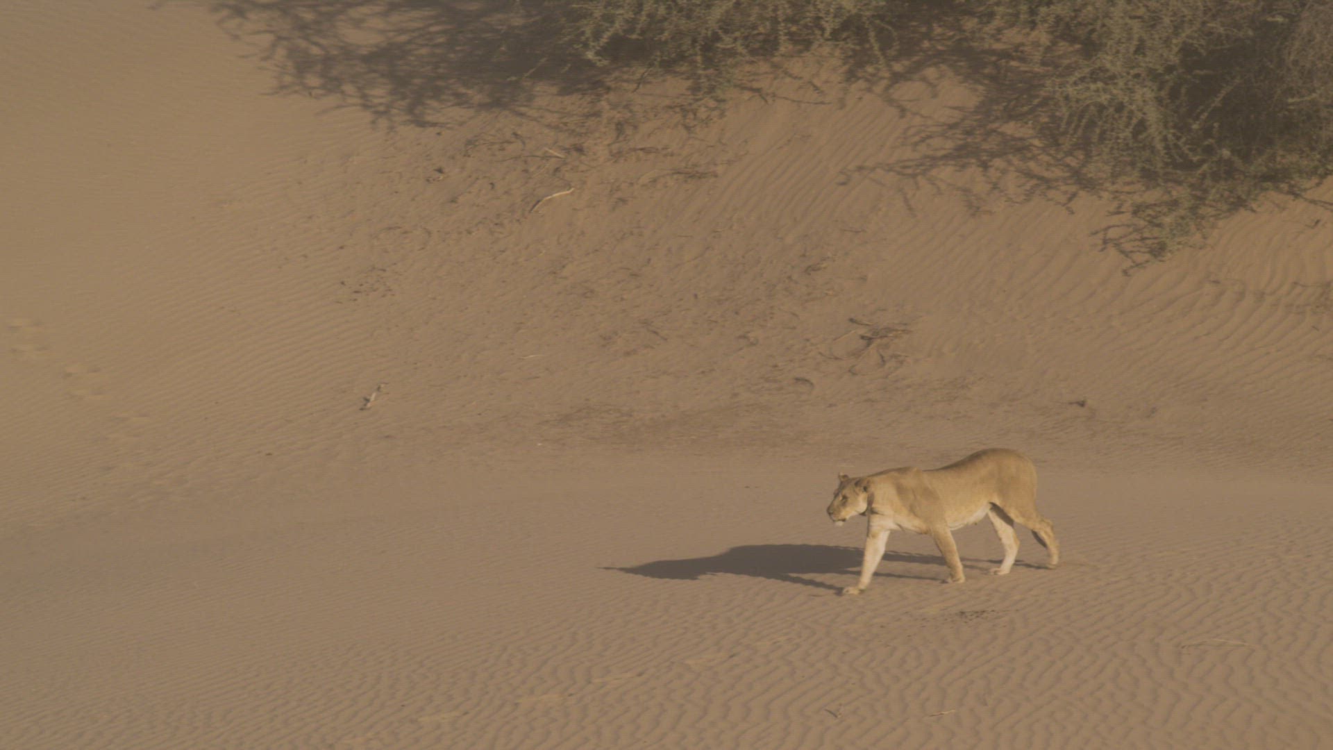 MS PAN Lioness (Panthera leo) walking on sand through desert / Namibia