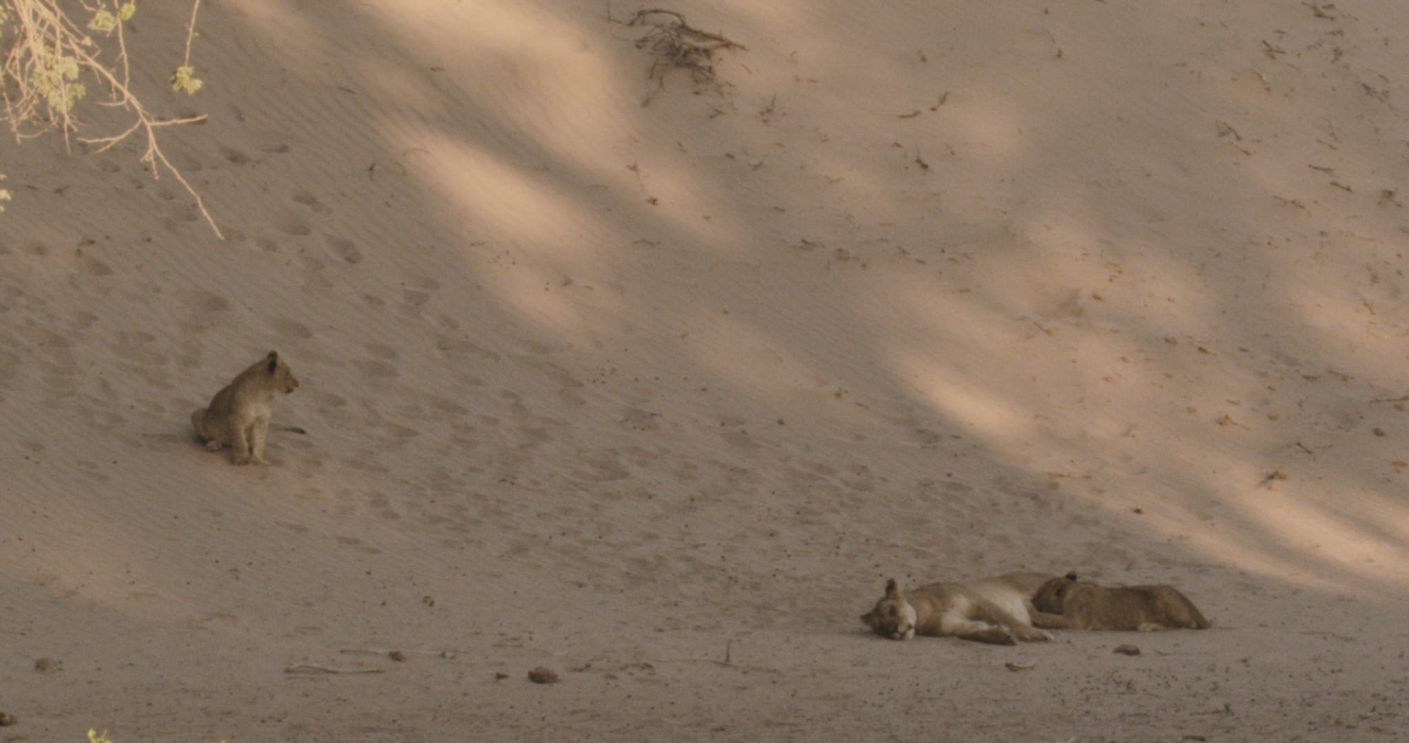 WS Three lions (Panthera leo) resting on sand in desert / Namibia