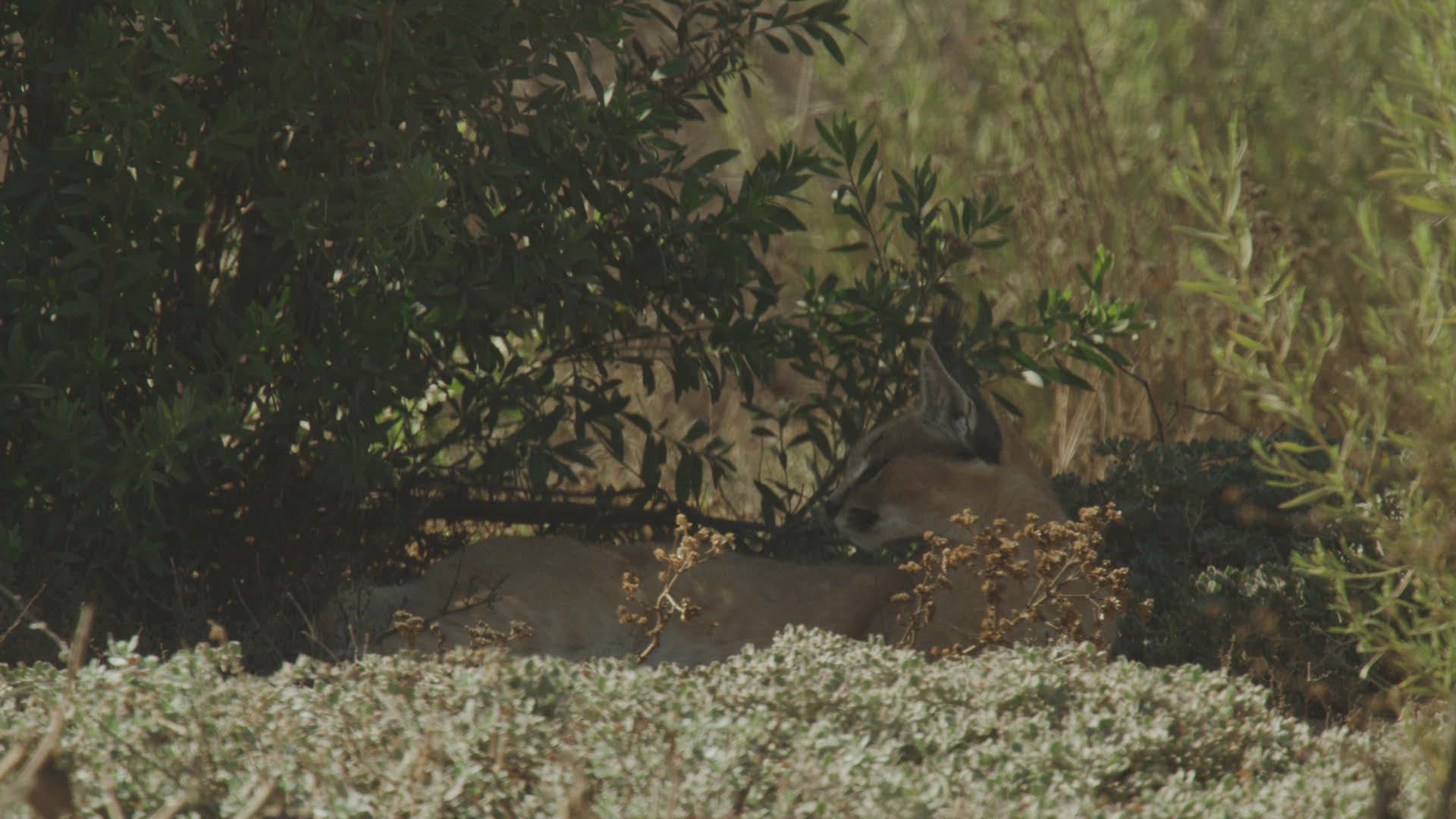 WS SELECTIVE FOCUS Caracal (Caracal caracal) lying down in bushes / Namibia