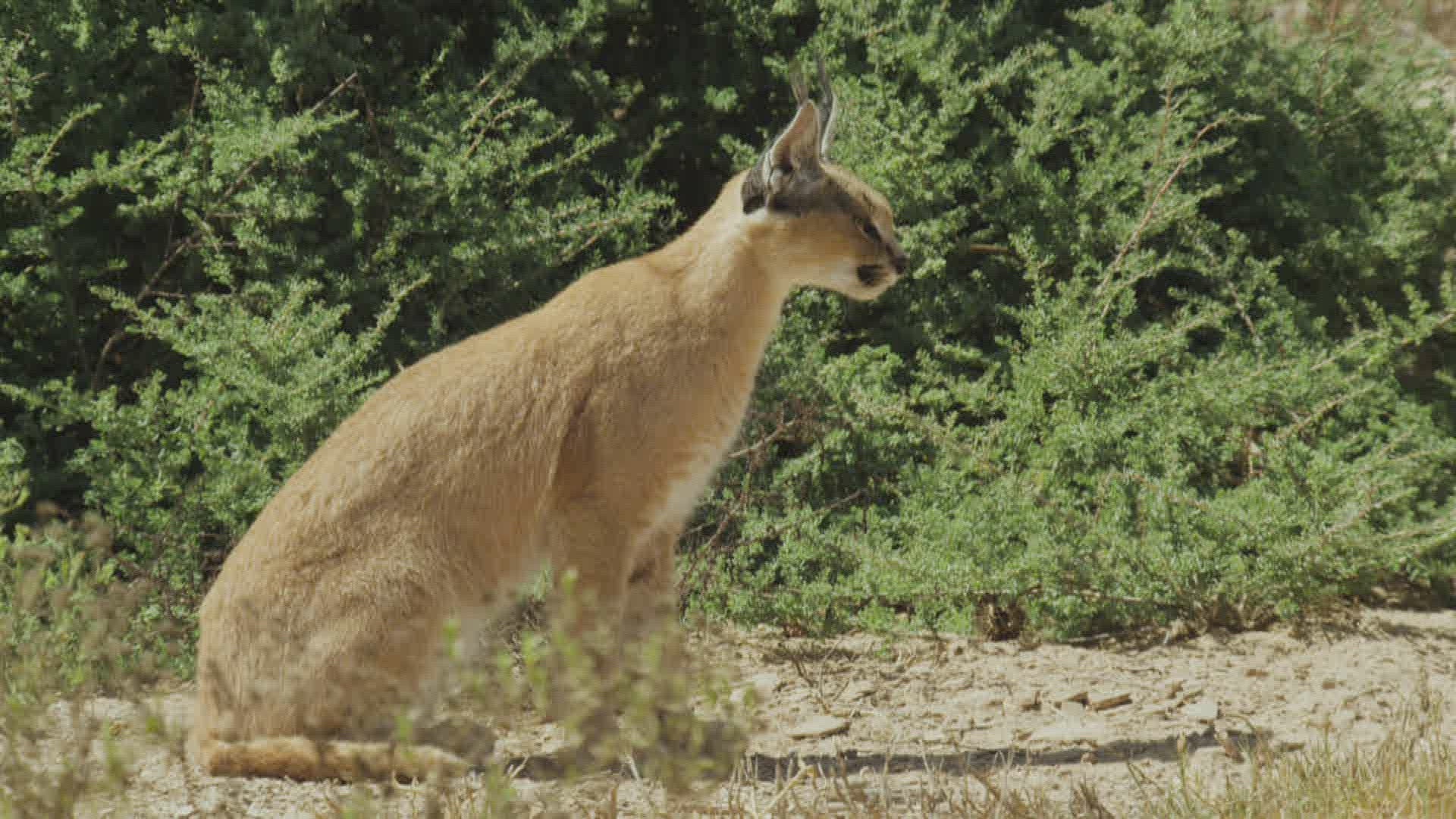 MS Caracal (Caracal pounces) sitting and looking away / Namibia