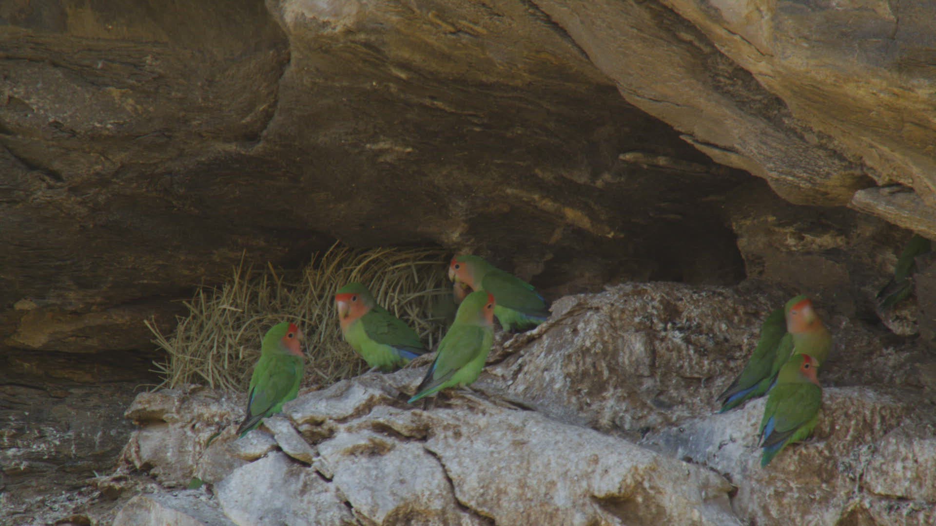 MS Rosy-faced lovebirds (Agapornis roseicollis) standing on rocks / Namibia