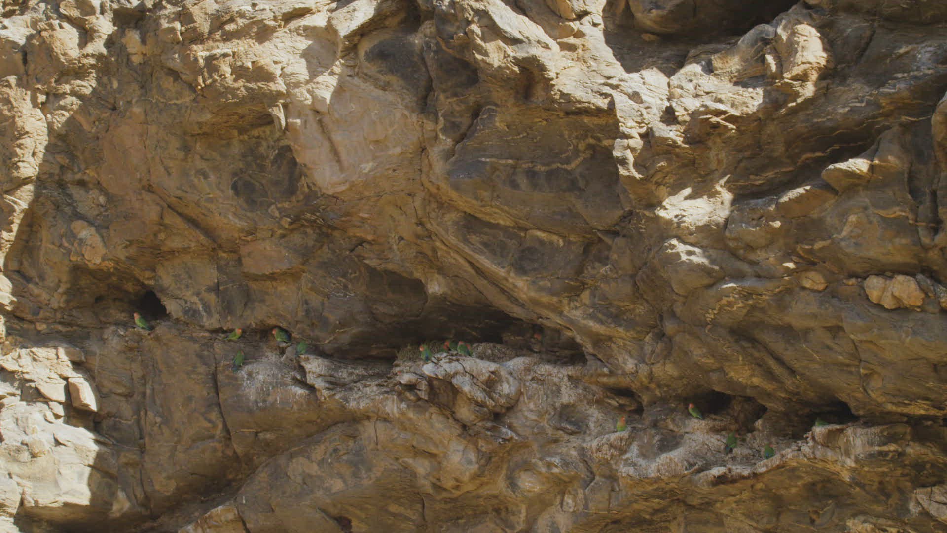 WS Rosy-faced lovebirds (Agapornis roseicollis) on rock with caves
