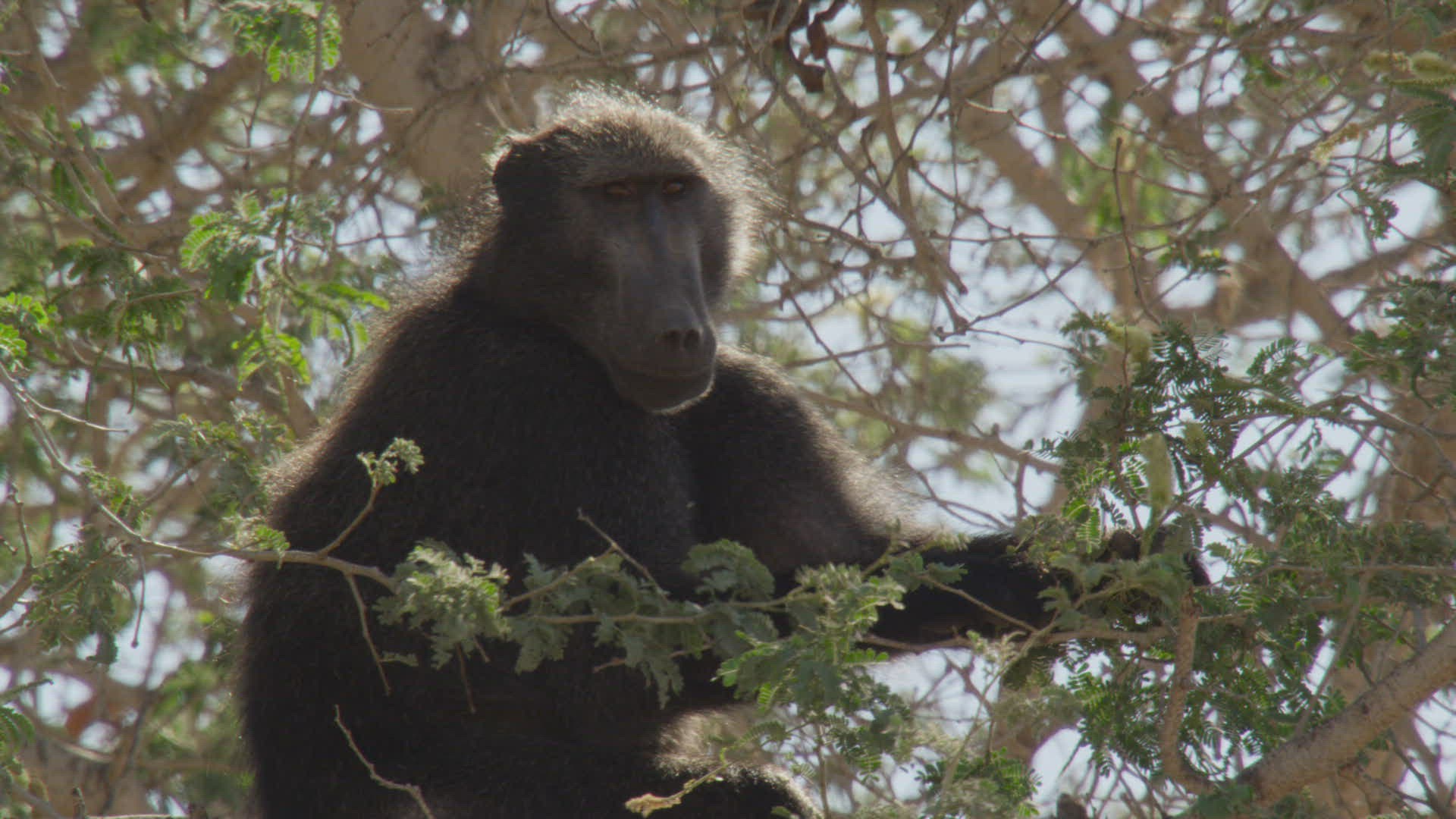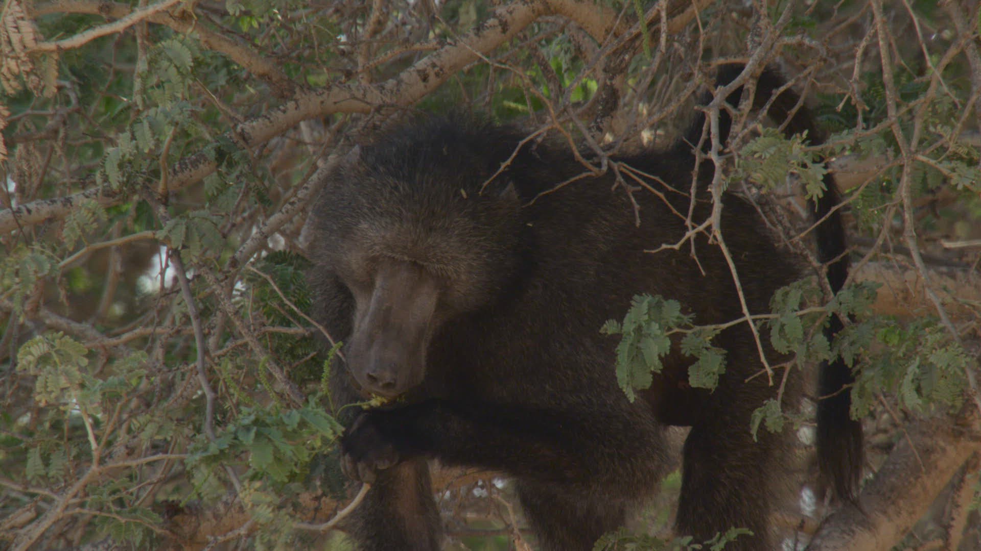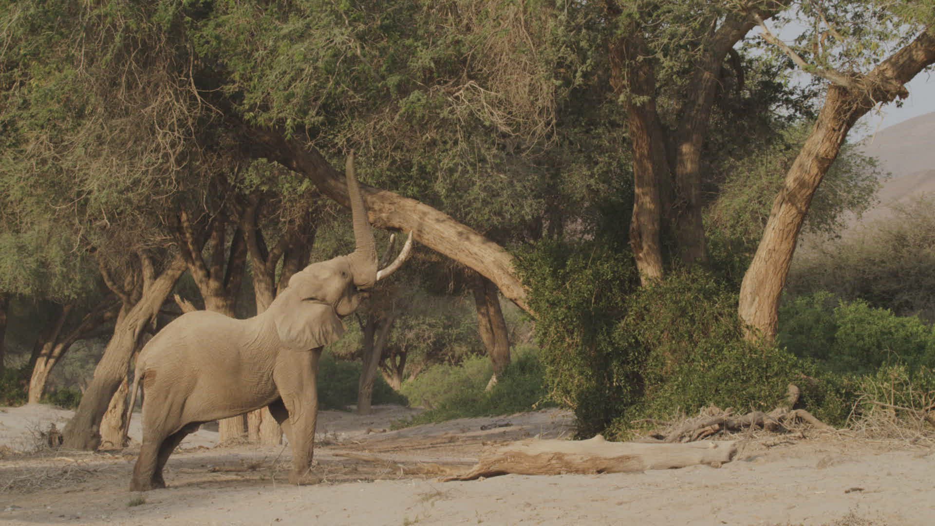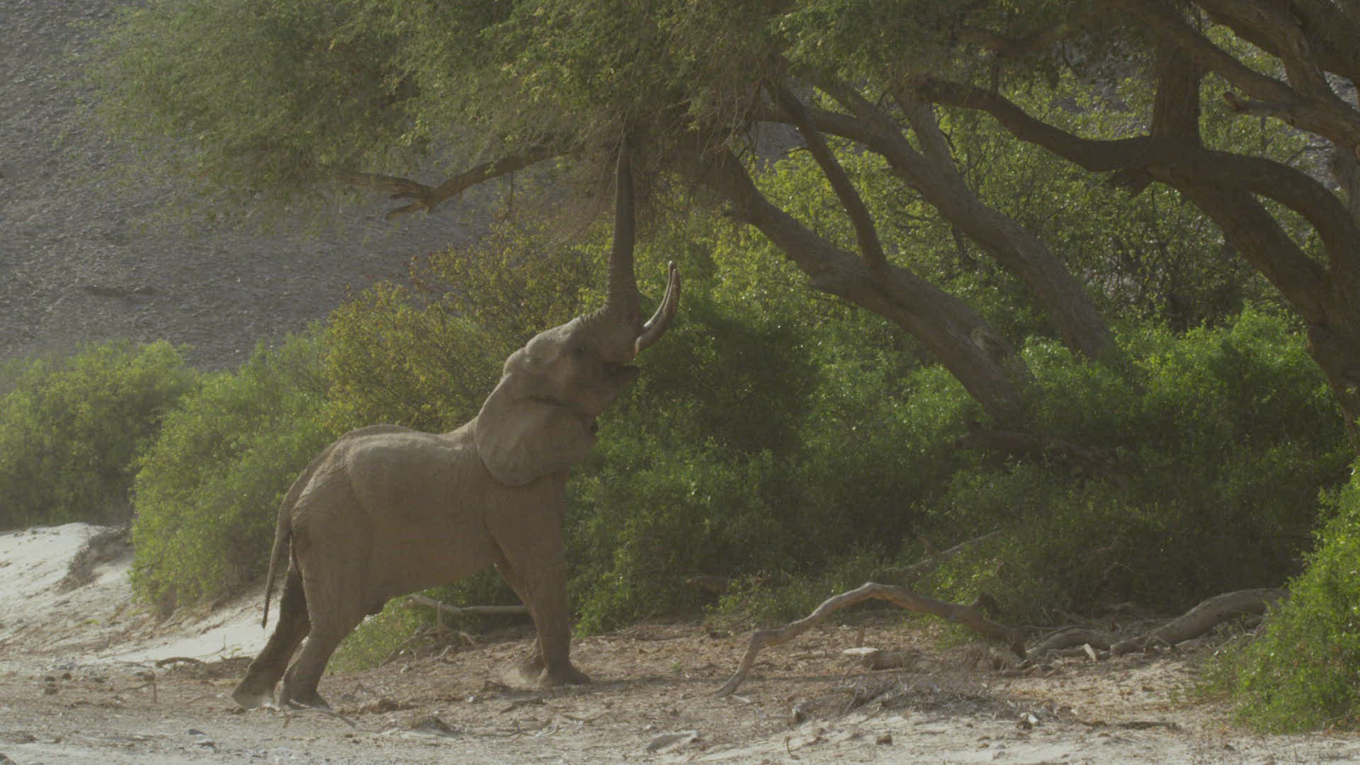 WS SLO MO Elephant (Loxodonta africana) raising trunk to reach leaves from tree/Namibia
