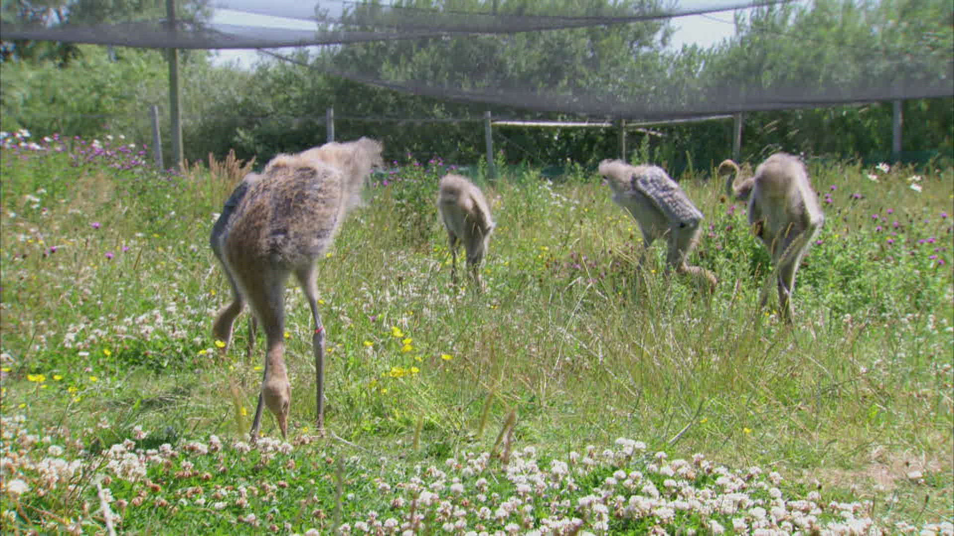 MS Young Common Crane (Grus grus) feeding on grass under netting / Slimbridge; Gloucestershire; England; UK