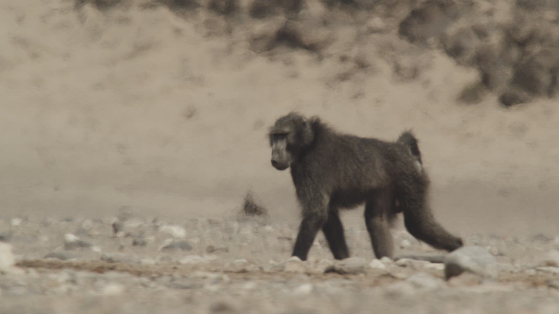WS TS Chacma baboons (Patio ursinus) and Elephant (Loxodonta africana) near waterhole in desert / Namibia