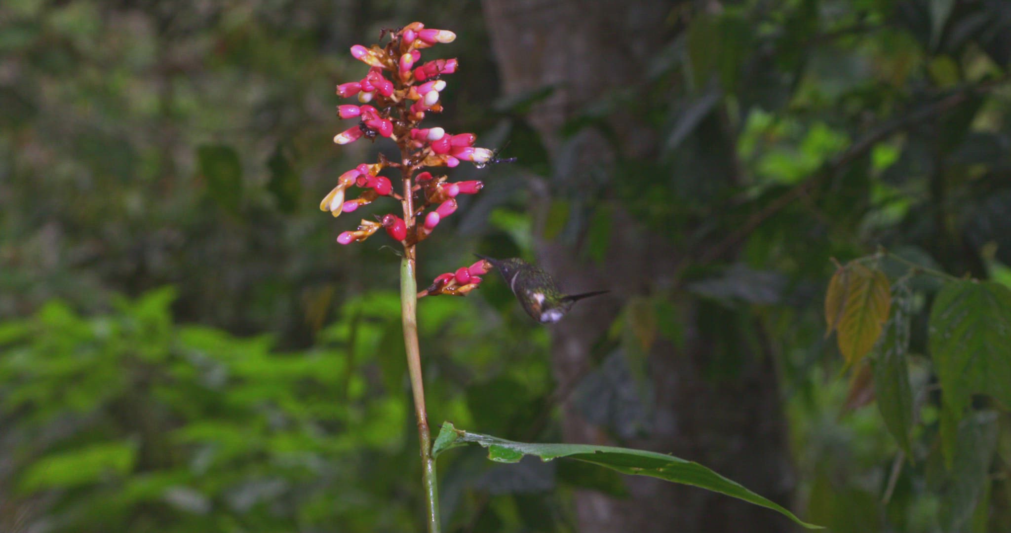 MS ZI SLO MO Violet-tailed Sylphs (Aglaiocercus coelestis) feeding on red flower / Tandayapa; Pichincha Province; Ecuador