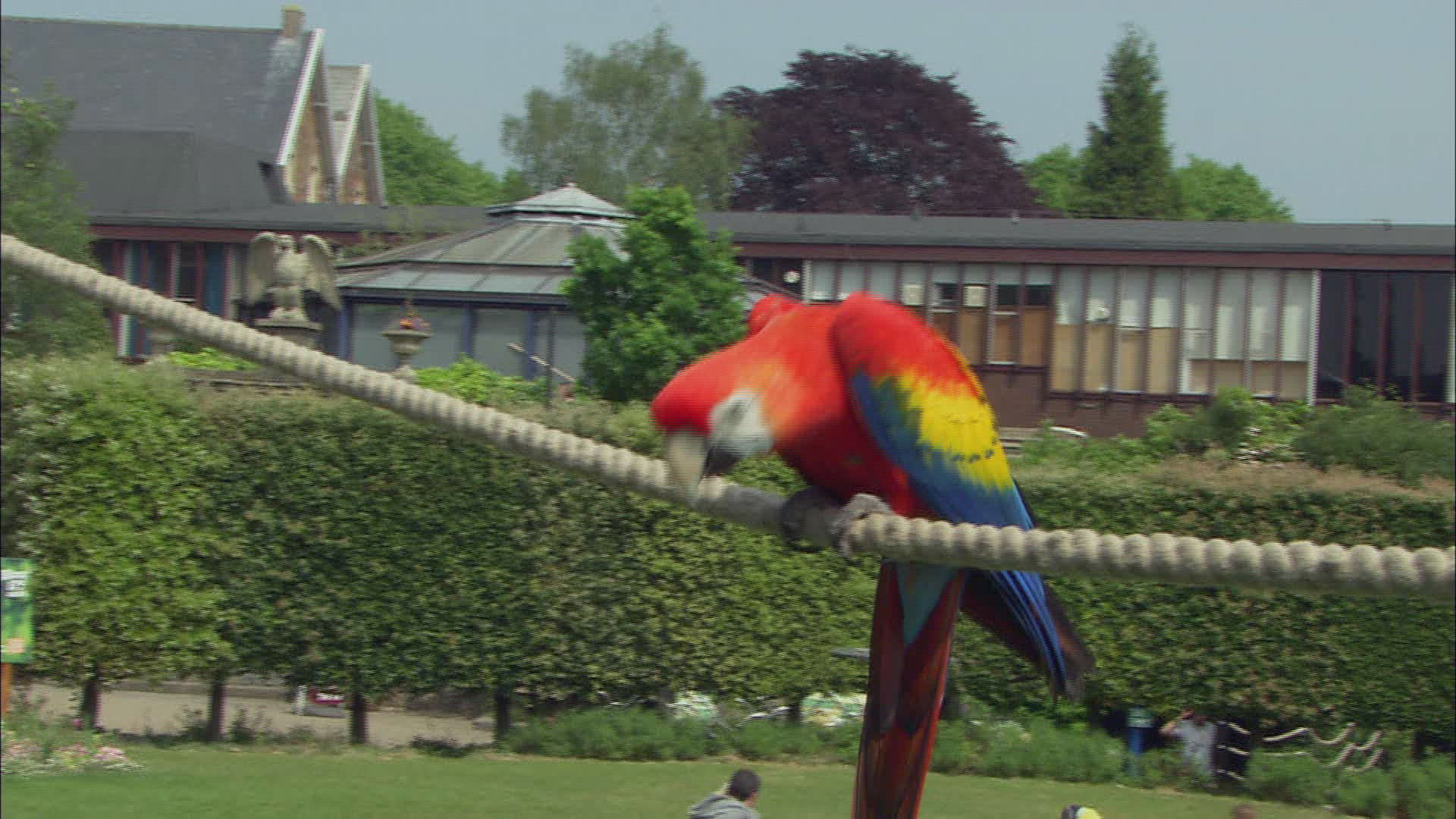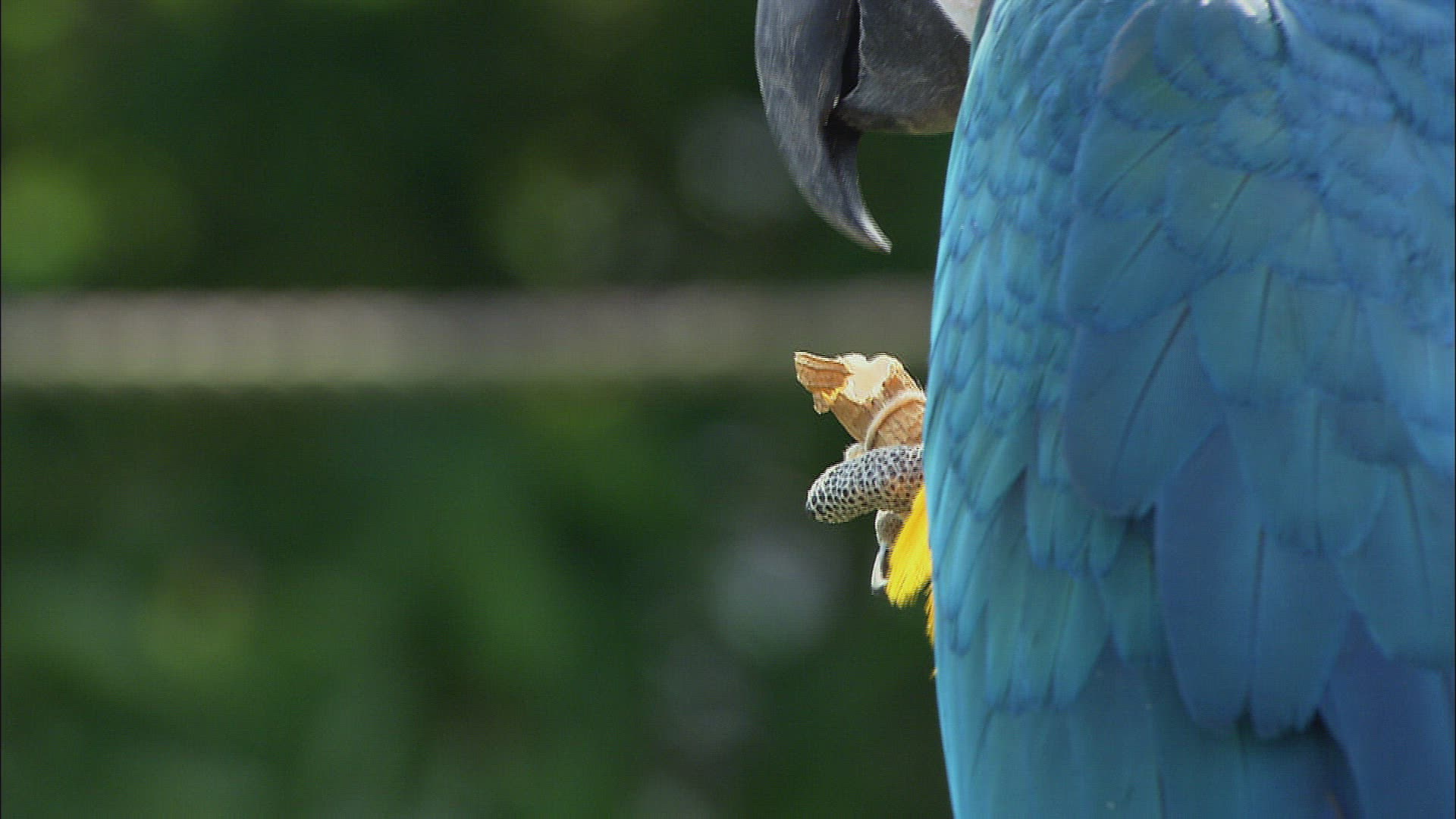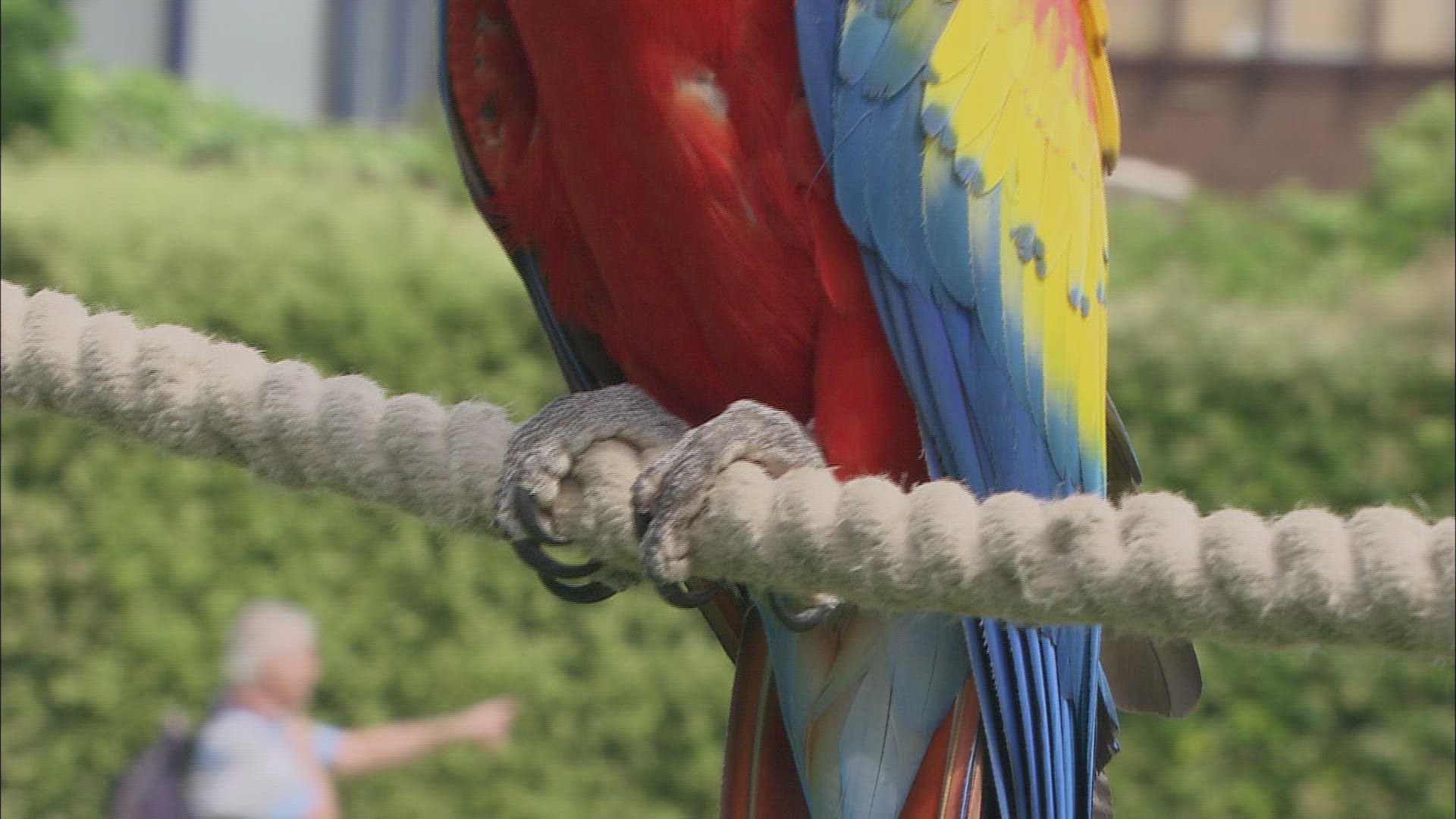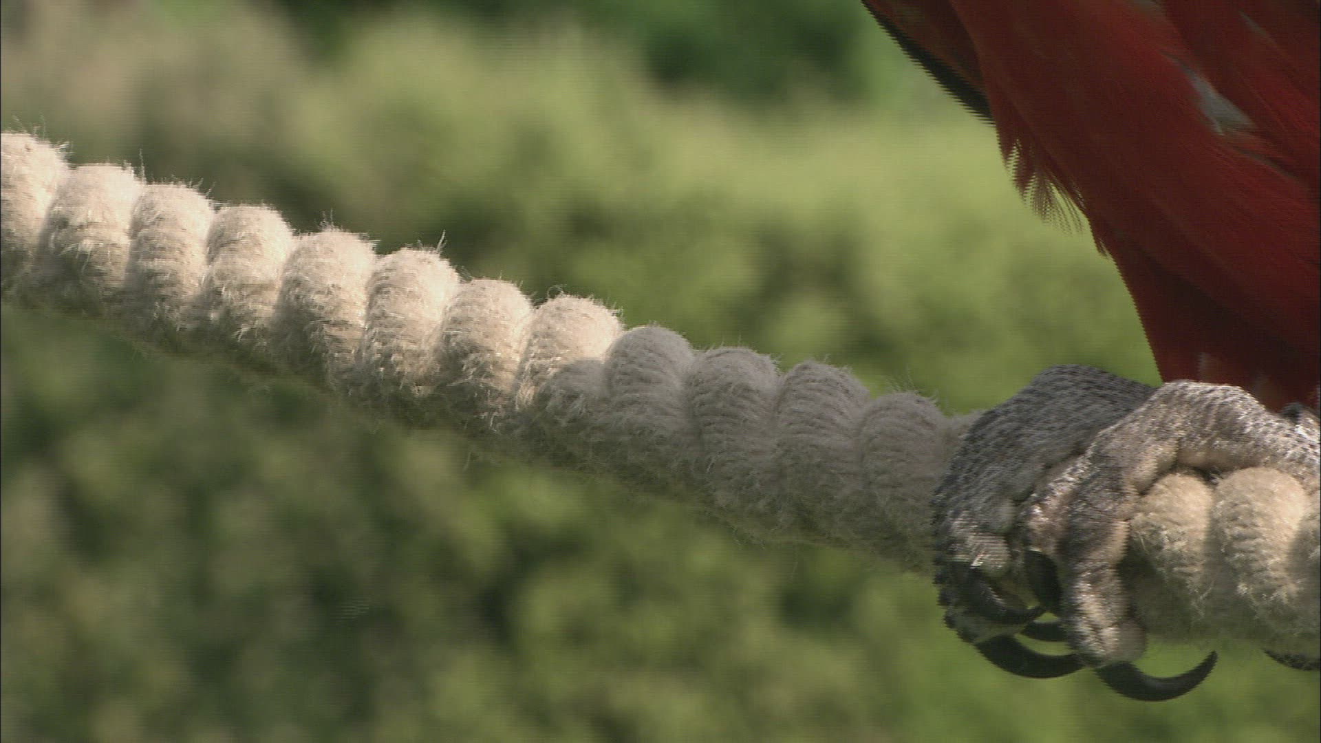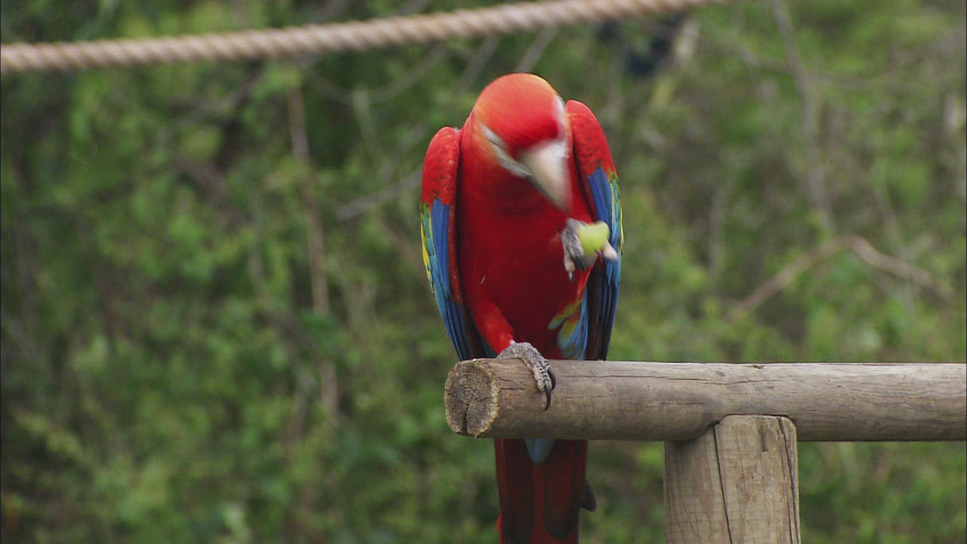 CU Head of Scarlet Macaw (Ara macao) eating on perch in Bristol Zoo Gardens / Bristol; Somerset; UK