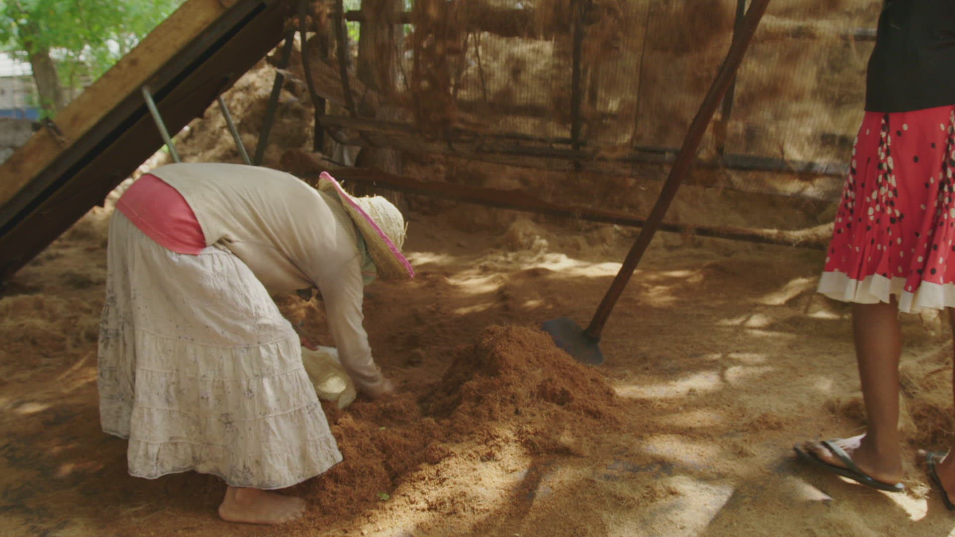 MS Woman packing milled coconut fibers into bags / Hambantota District; Southern Province; Sri Lanka