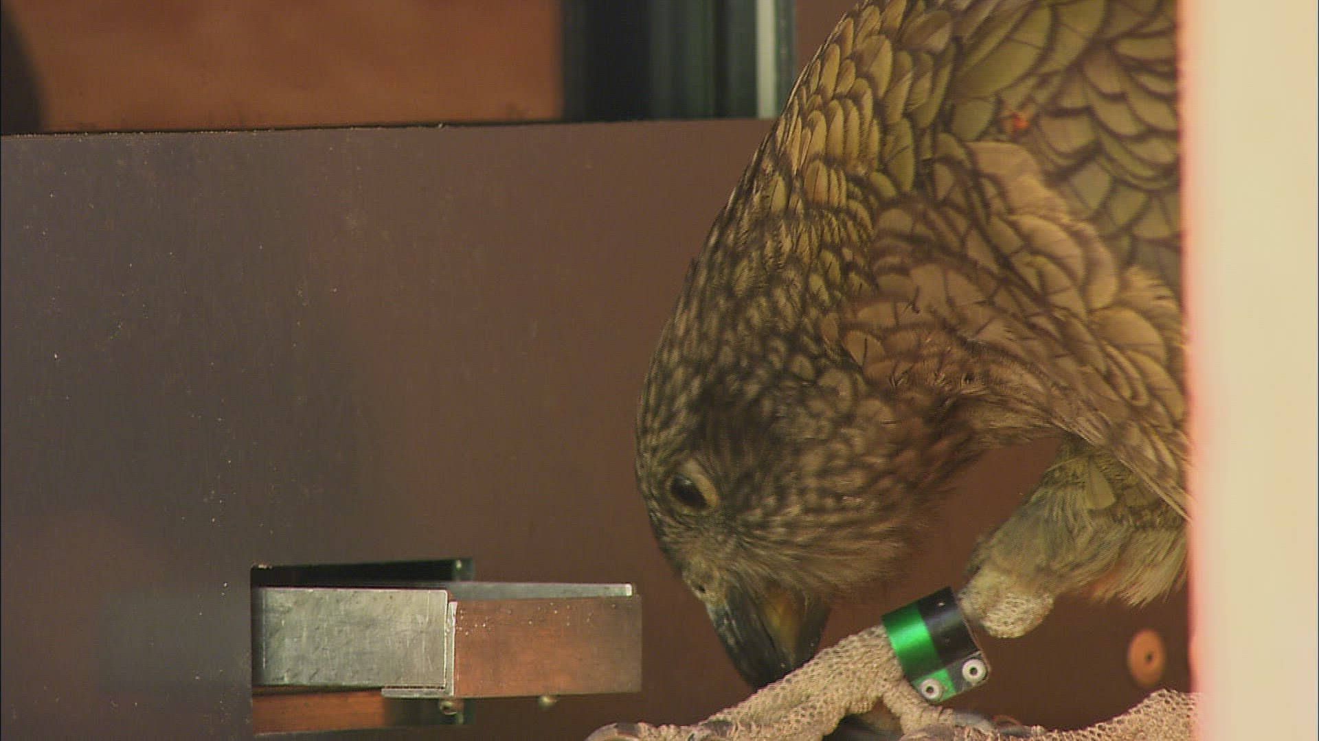 CU TD TU Kea (Nestor notabilis) touching screen; Haidlhof Centre / Baden bei Wien; Austria