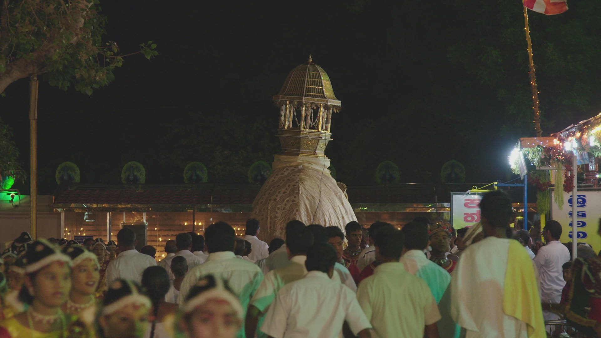 MS TD Dancers and spectators walking during festival in honor of Kataragama deviyo / Kataragama; Uva Province; Sri Lanka