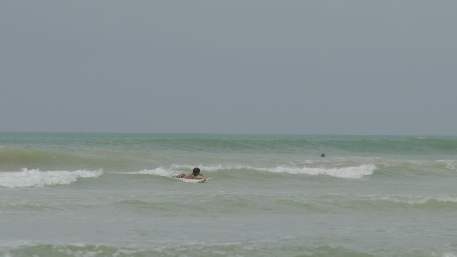 WS PAN TS Boy swimming on surfboard towards land / Weligama; Southern Province; Sri Lanka