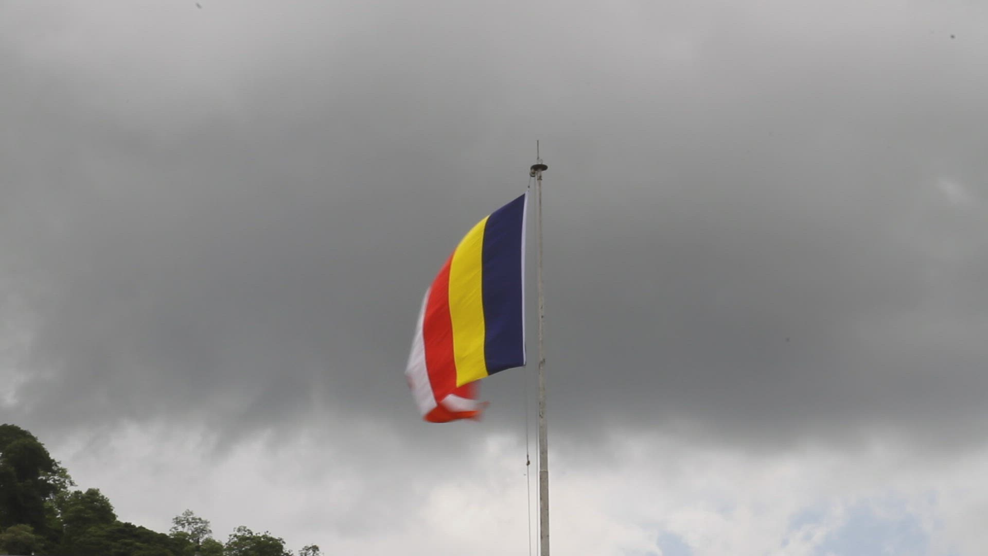 WS Buddhist flag on top of Buddhist temple / Southern Province; Sri Lanka