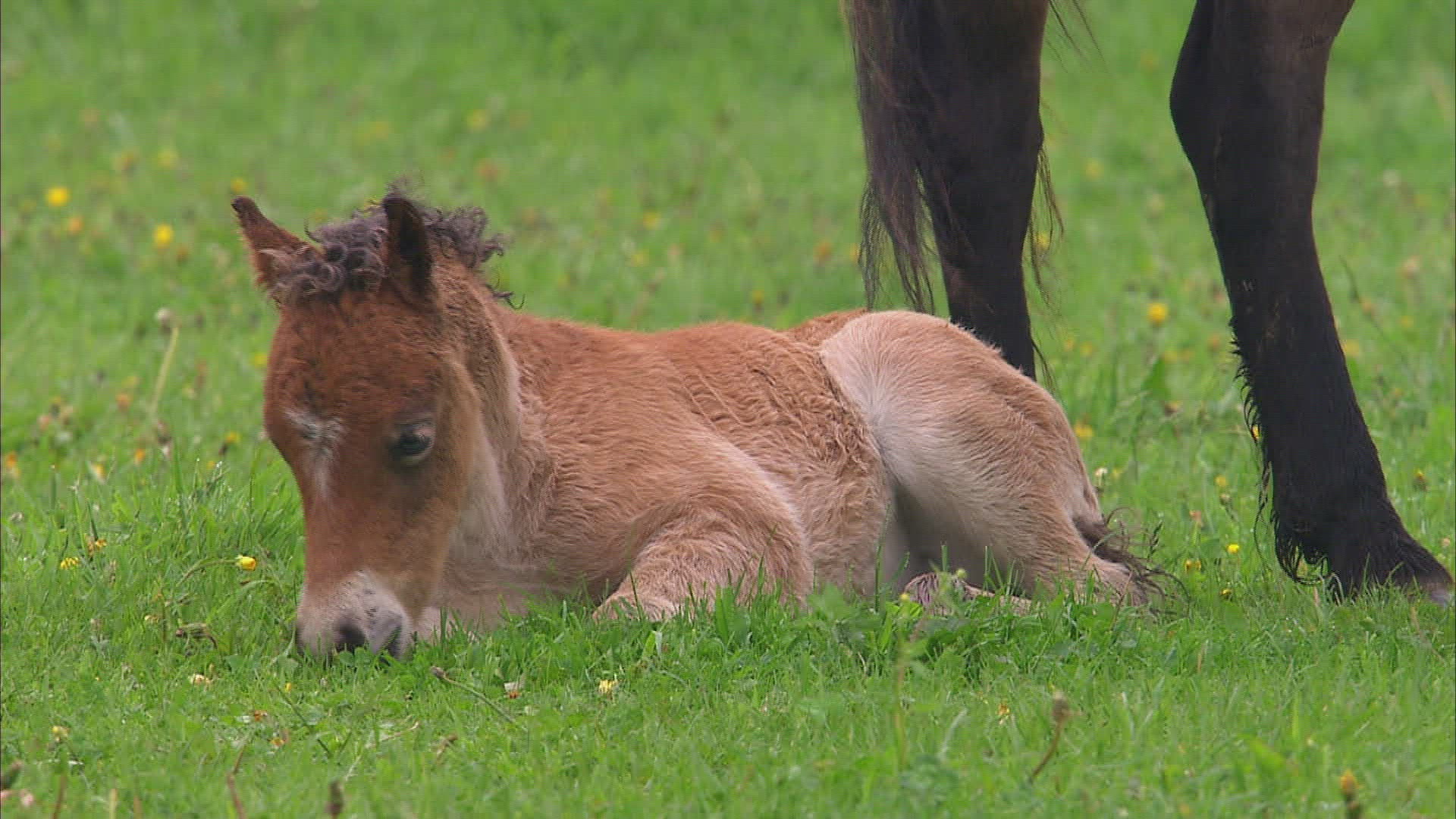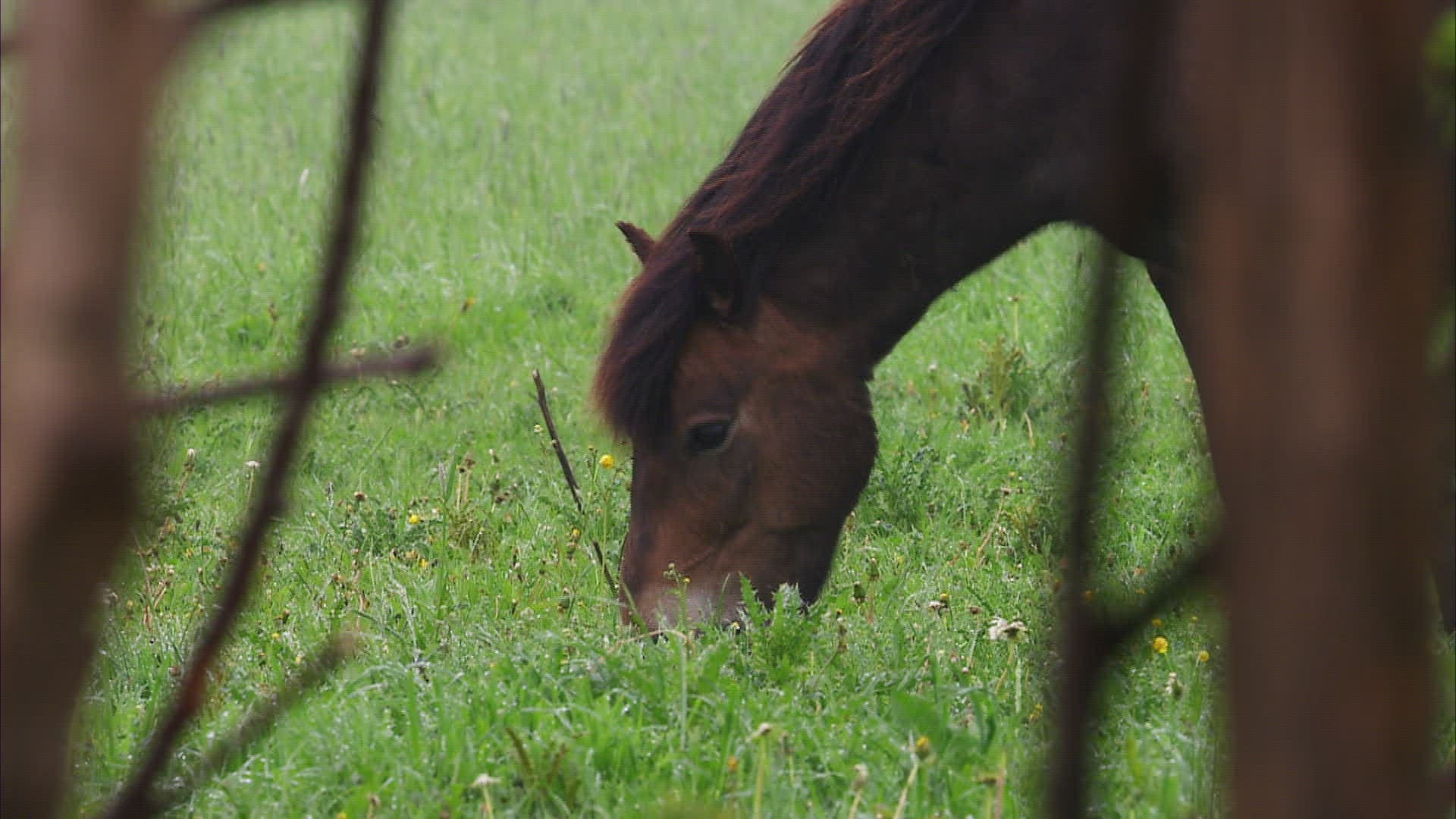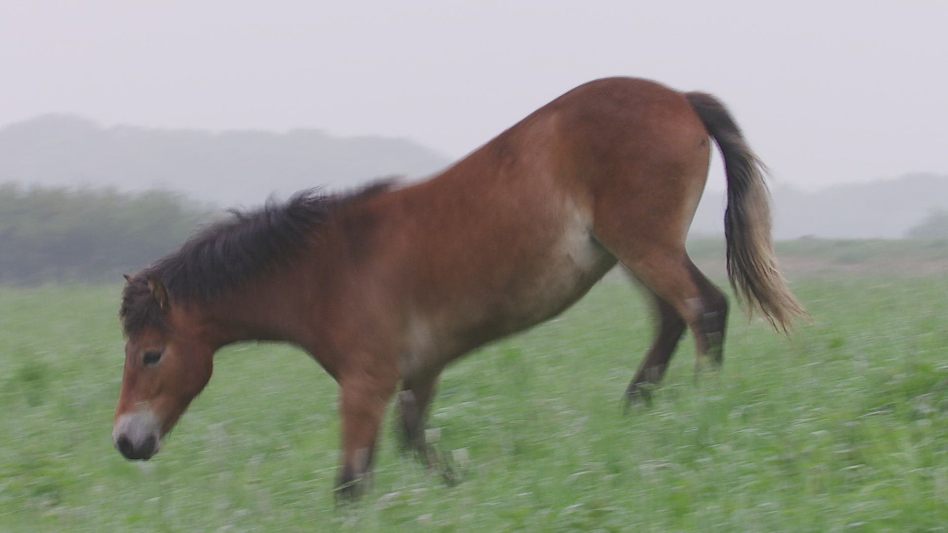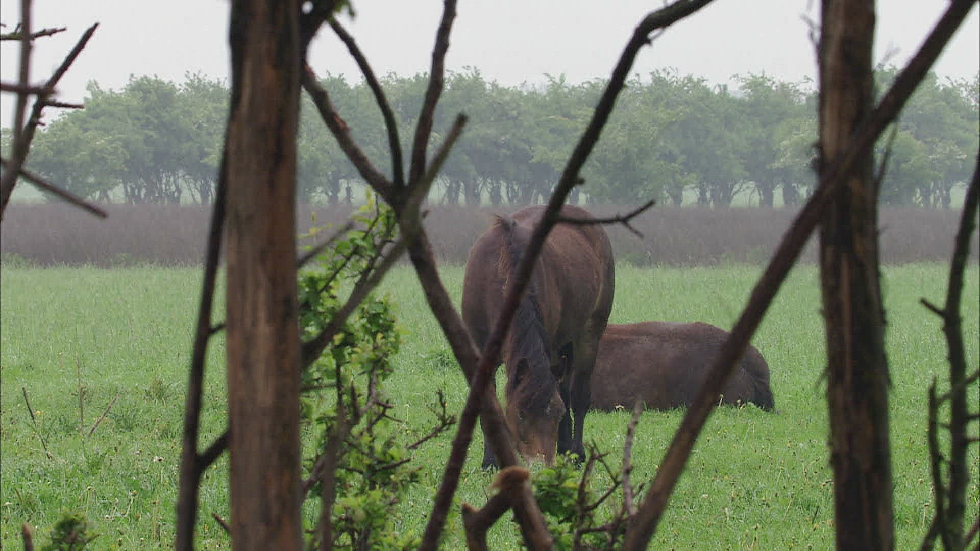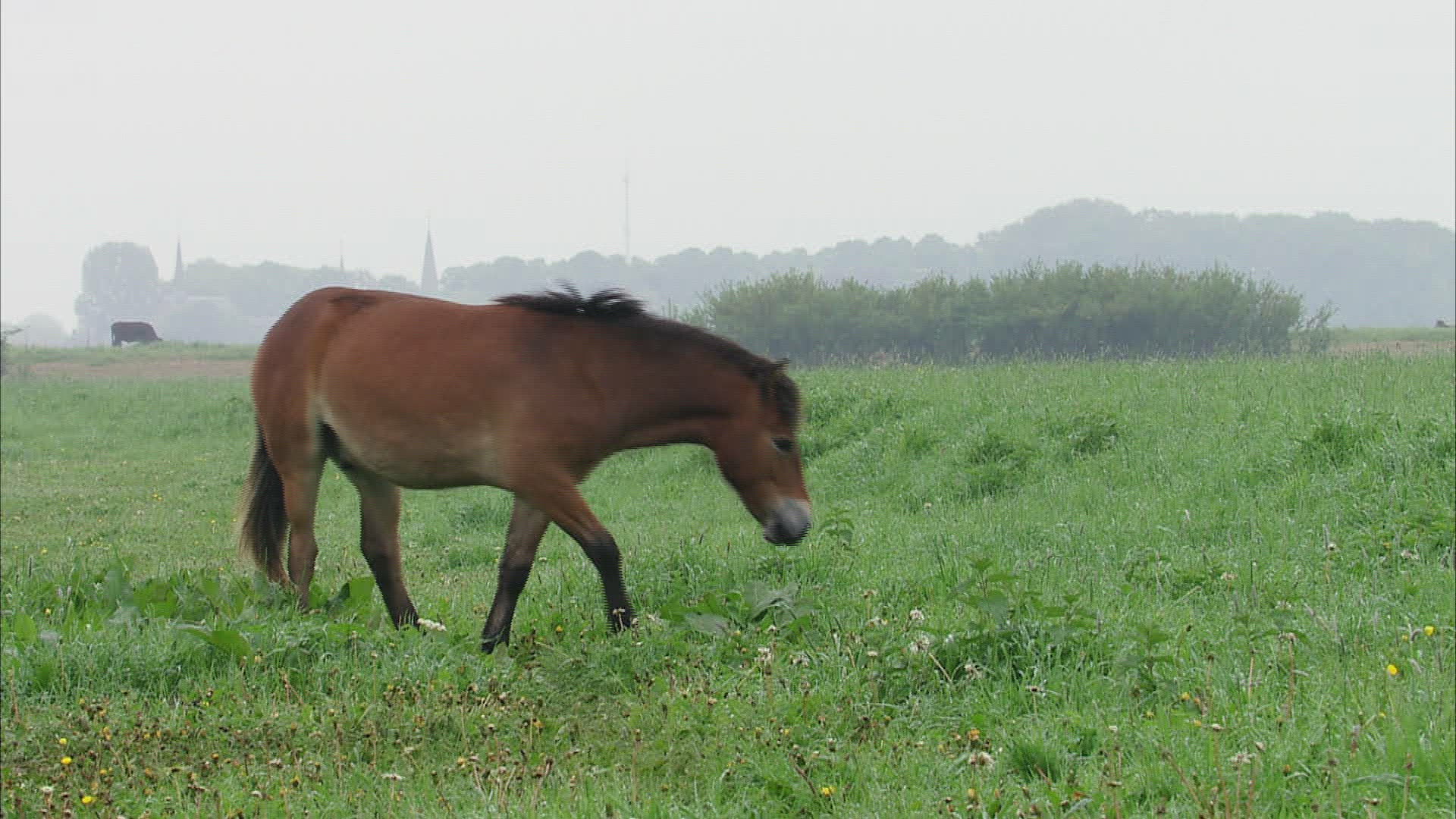 CU SELECTIVE FOCUS Exmoor pony (Equus ferus caballus) against overcast sky / Milheeze; Noord Brabant; Netherlands