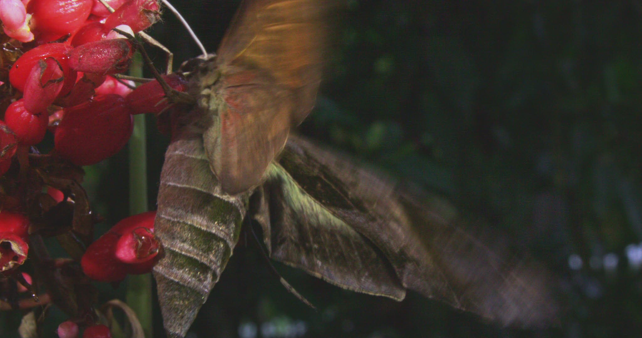 WS Purple-throated woodstar (Calliphlox mitchellii) flying around red flower with static moth / Tandayapa; Pichincha Province; Ecuador