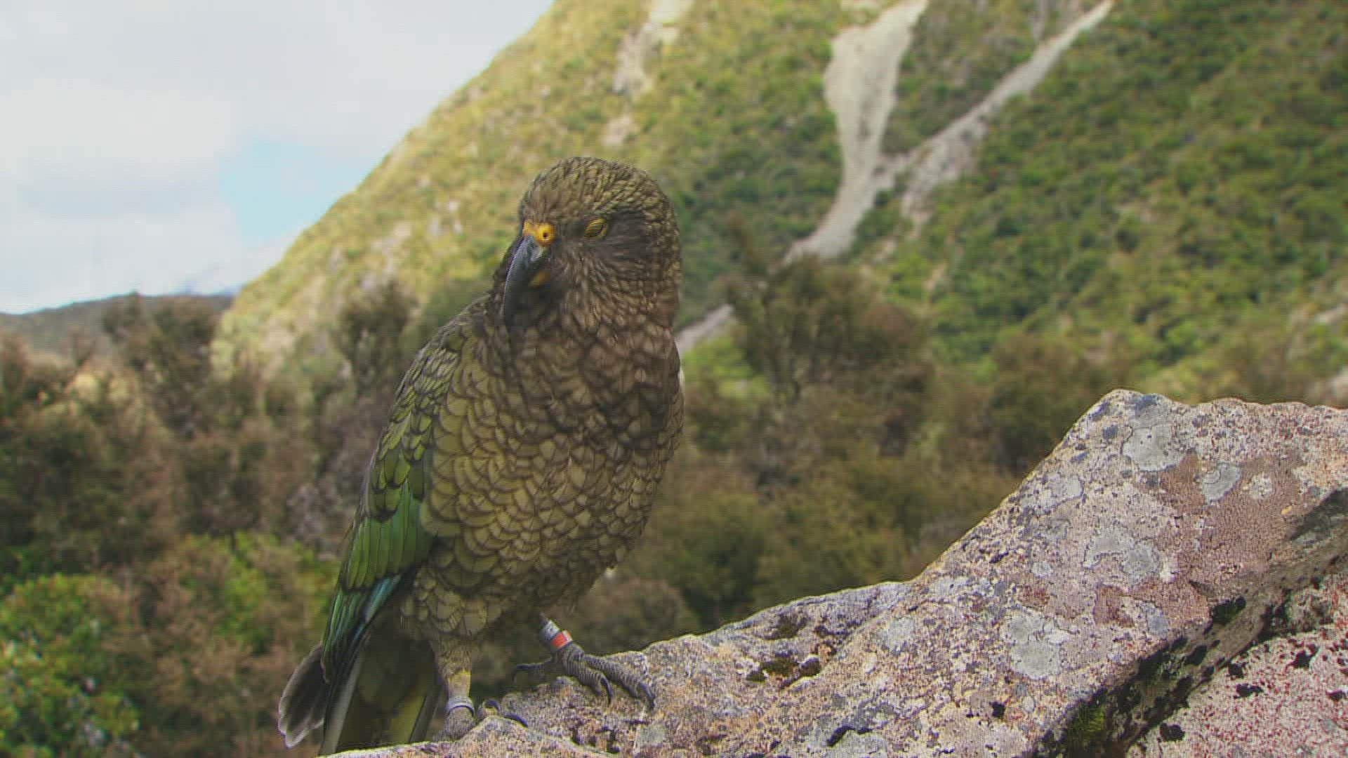 MS TS Kea (Nestor notabilis) perching on railing and tearing taped material; Arthur's Pass National Park / Canterbury; New Zealand