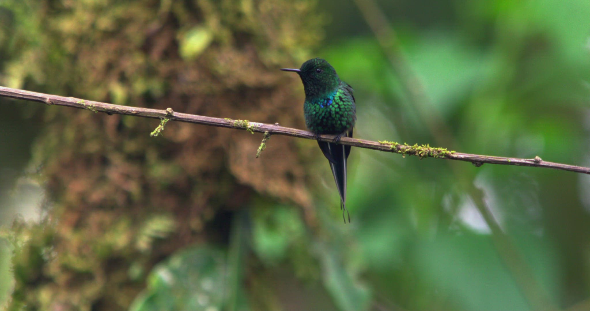 MS SLO MO Green thorntail (Discosura conversii) perching on branch in Milpe; then taking off / Los Bancos Canton; Pichincha Province; Ecuador