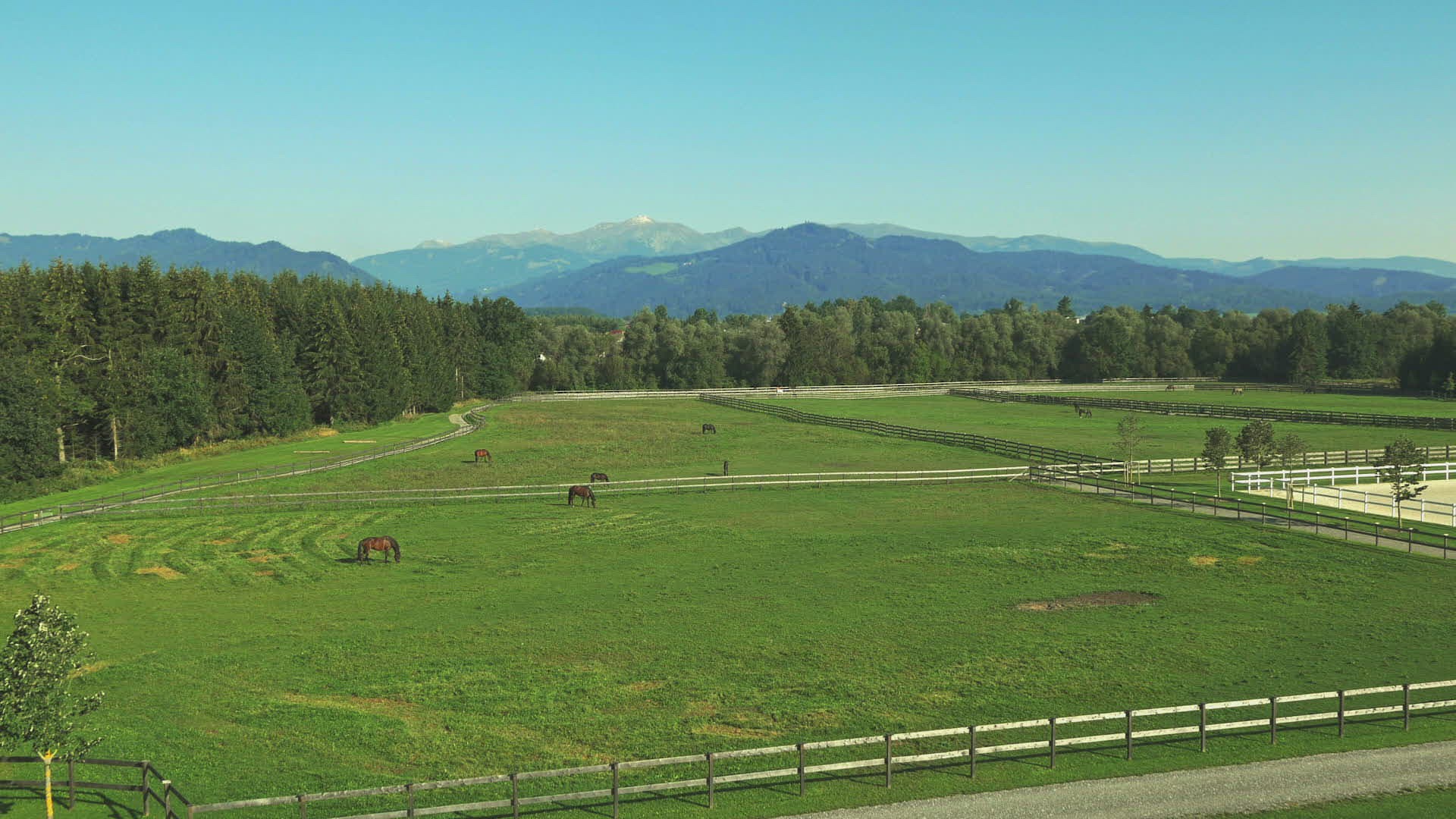 WS POV Landscape with Trakehners (Equus ferus caballus) and mountain range in background / Gestut Murtal; Grosslobming; Austria