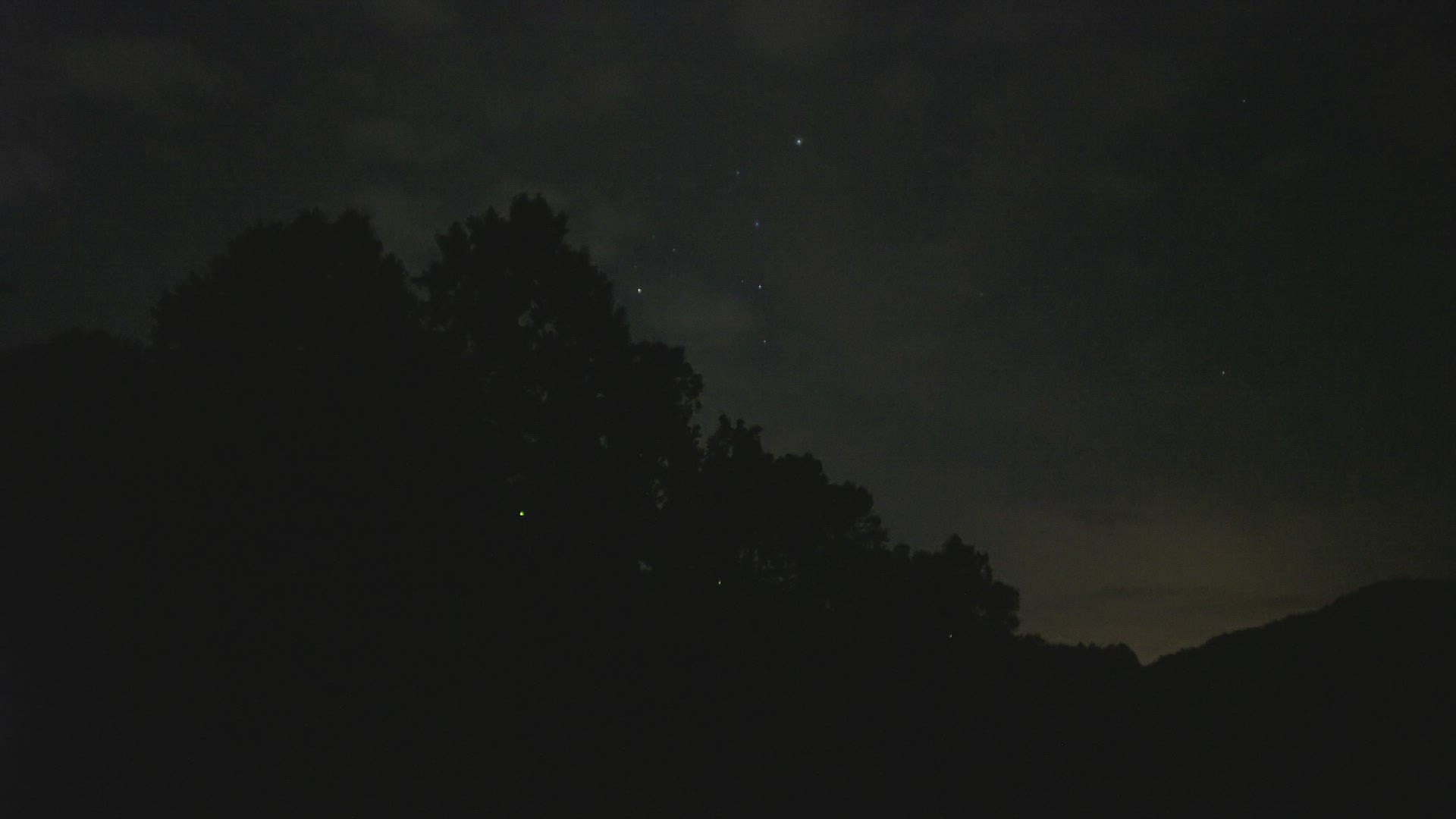 WS PAN Chinese Lanterns (Photuris versicolor) glowing in Allegheny National Forest; with lightning on night sky / Tionesta; Pennsylvania; USA