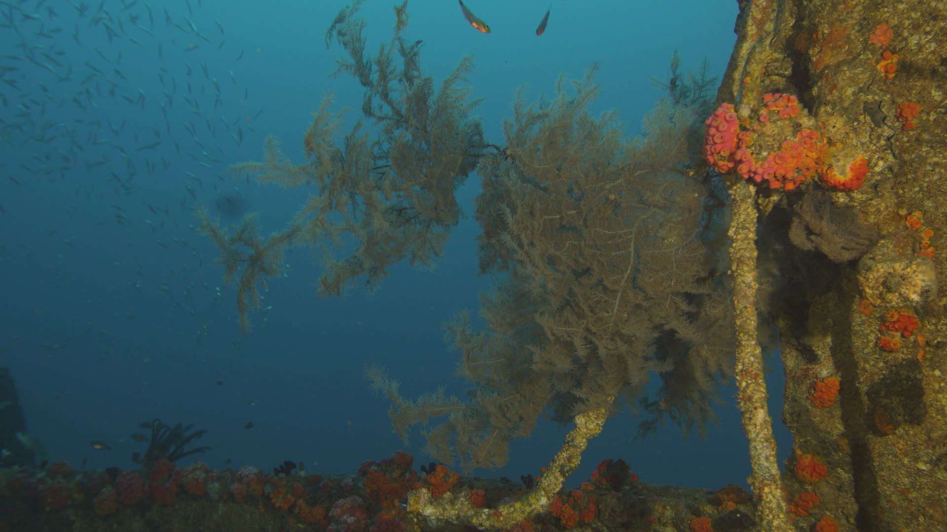MS POV Coral on shipwreck; fish swimming by in Indian Ocean / Sri Lanka
