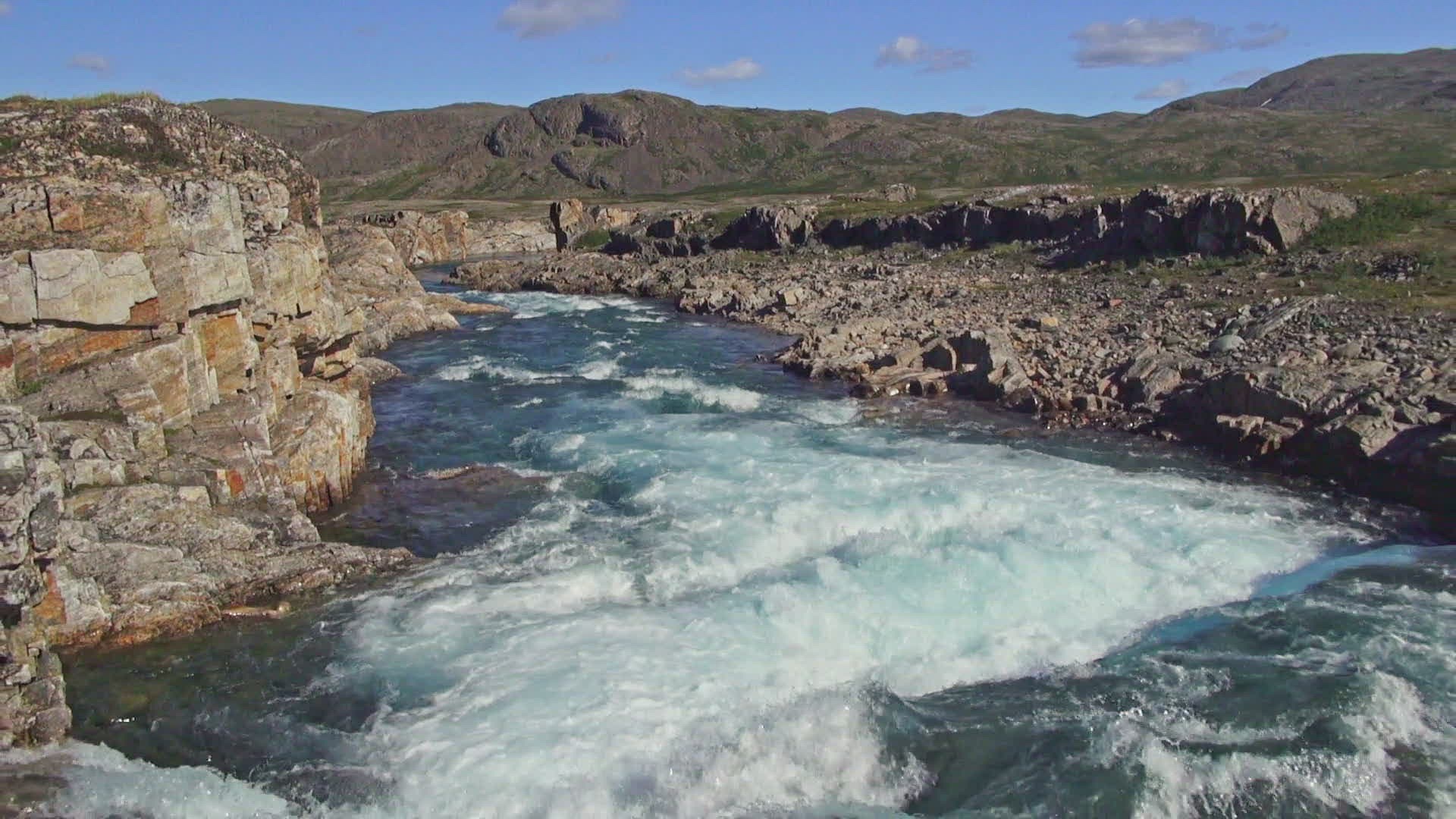 MS AERIAL Rough river flowing in Rapid Lake Lodge / Lyster; Quebec; Canada