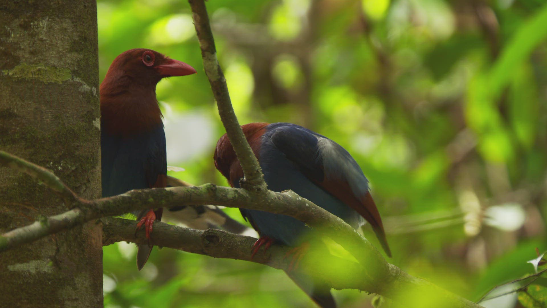 MS Two Black-billed magpies (Pica hudsonia) sitting on branch and grooming / Sri Lanka