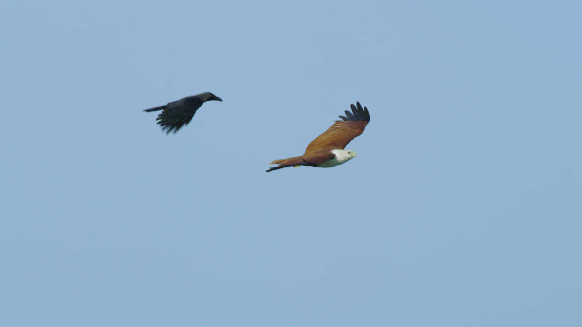 SLO MO WS TS House crow (Corvus splendens) mobbing White-bellied Sea-eagle (Haliaeetus leucogaster) in flight / Southern Province of Sri Lanka