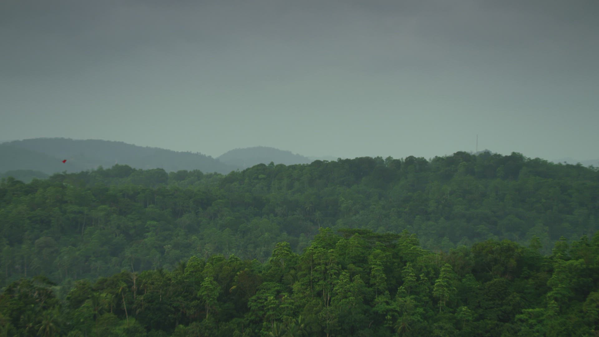 WS Indian flying fox (Pteropus giganteus) flying against forest / Sri Lanka