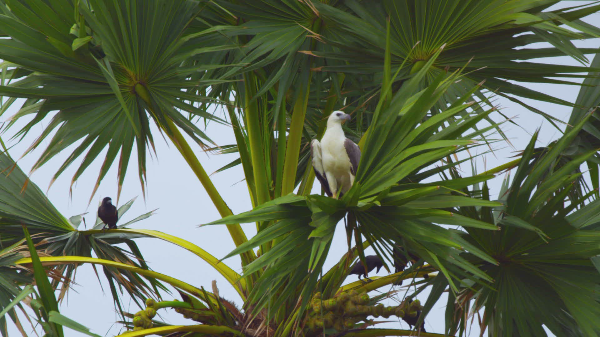 MS Crows (Corvus macrorhynchos) and White-bellied Sea-eagle (Haliaeetus leucogaster) perching on palm tree / Southern Province; Sri Lanka