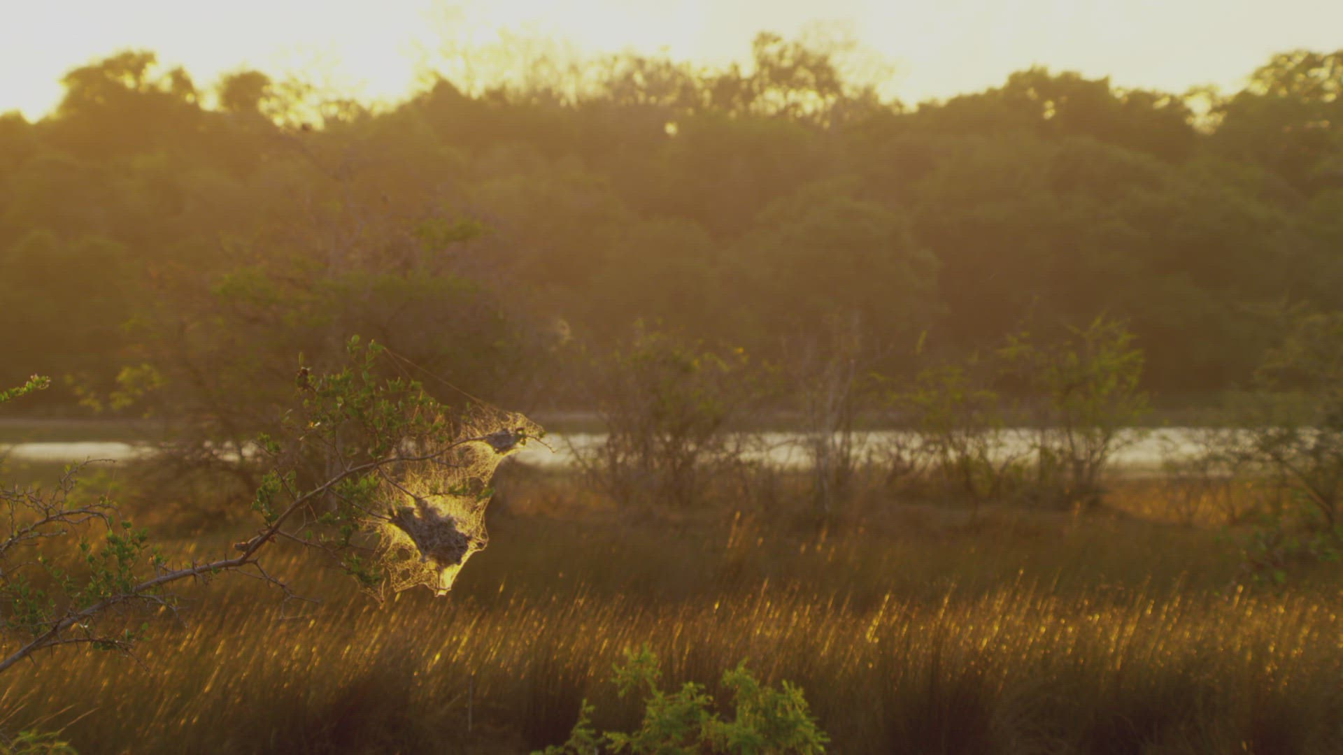 WS Cobweb on branch over tall grass against sunlight / Yala National Park; Southern Province; Sri Lanka