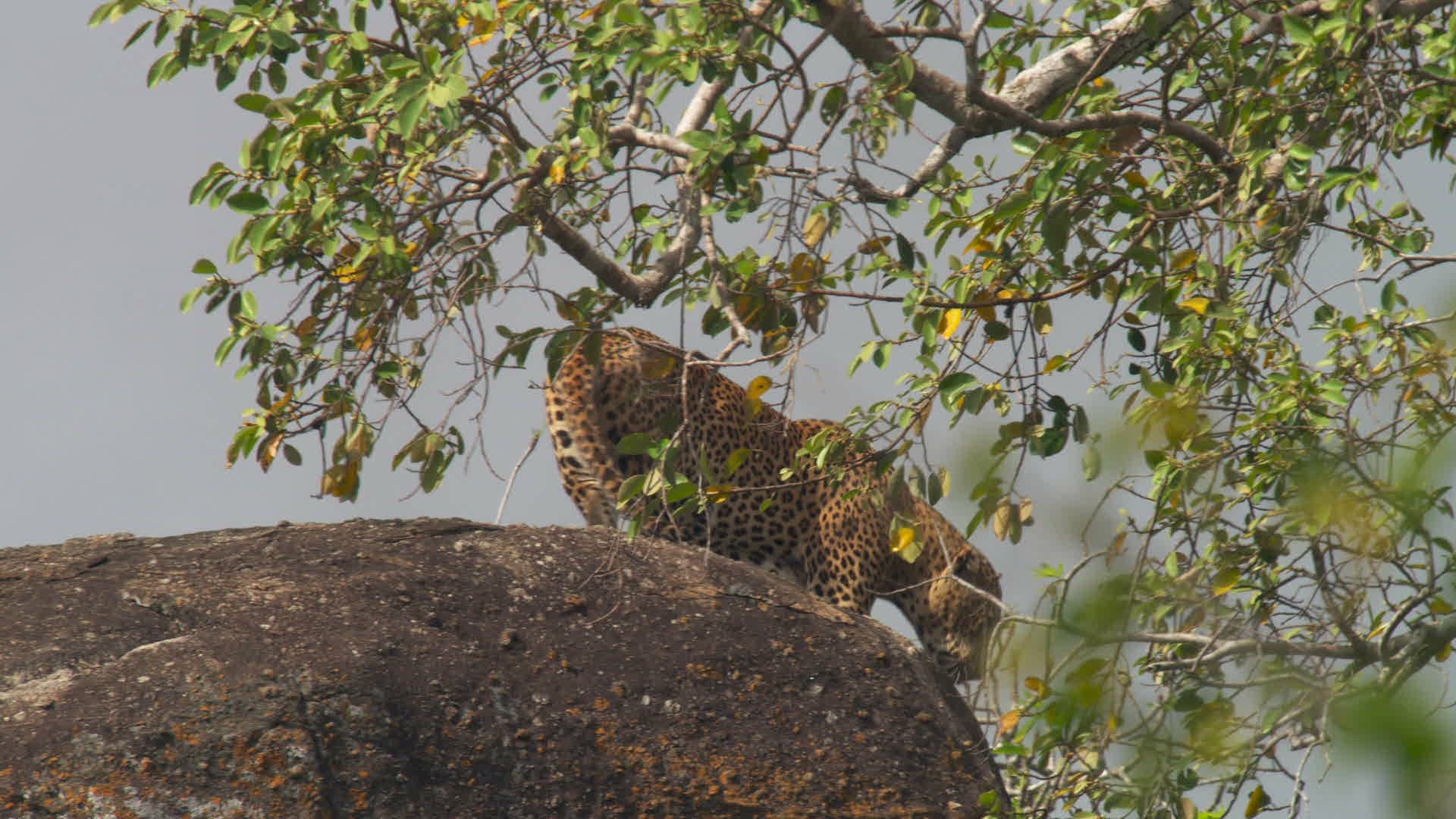 MS TD PAN Leopard (Panthera pardus) descending rocks among trees / Yala National Park; Southern Province; Sri Lanka